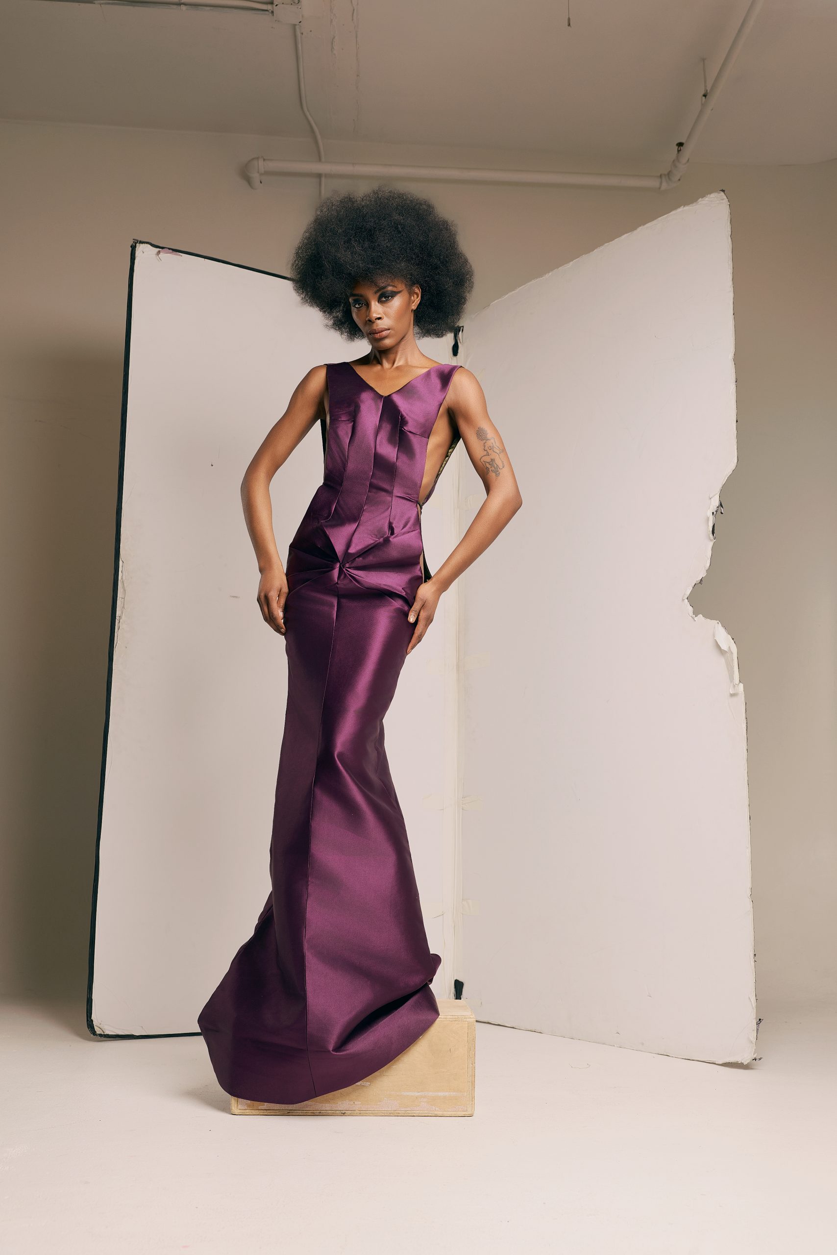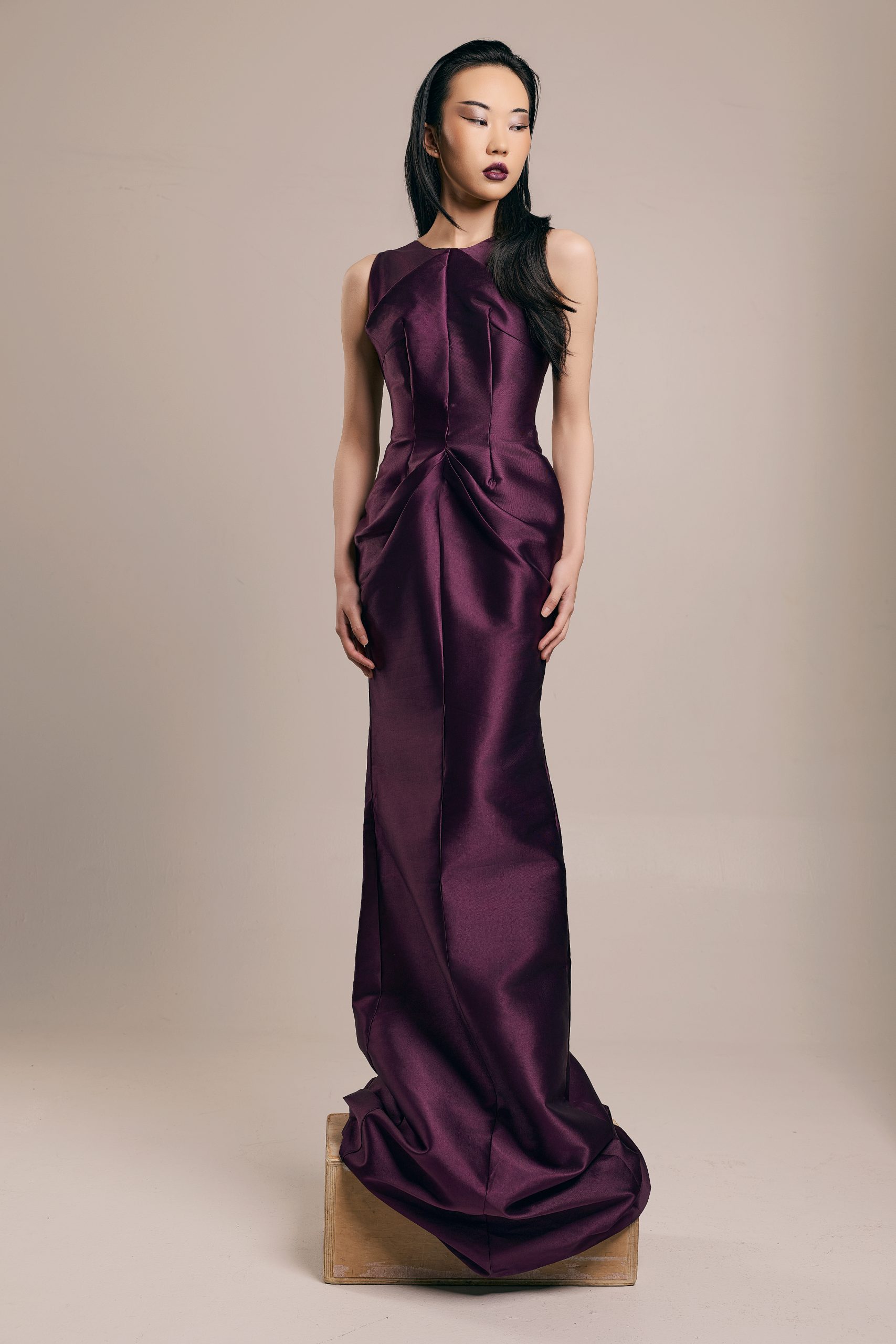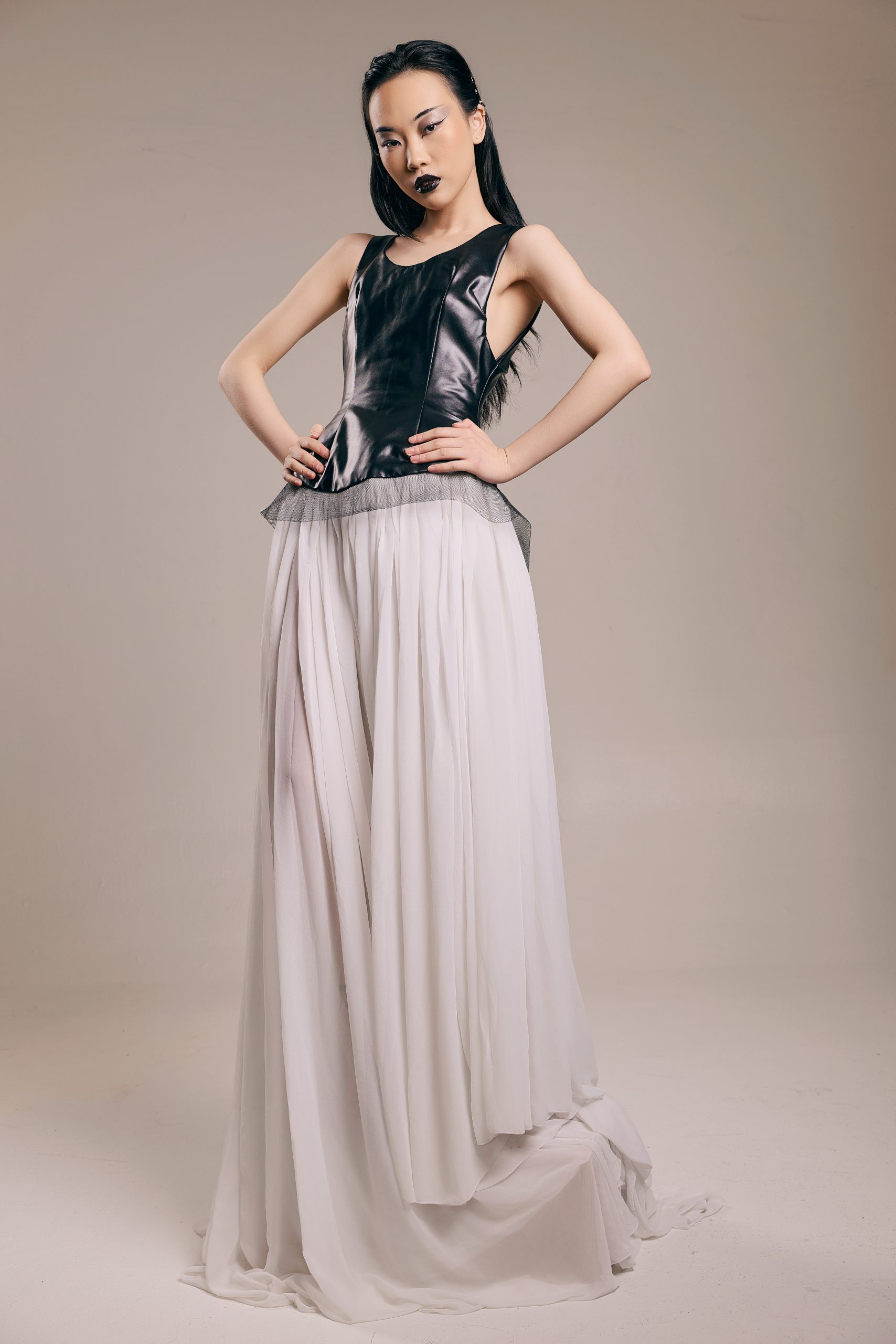 A corset of lacquered black against rivers of white chiffon. Deep aubergine satin pulled into precise seams that open suddenly into trailing lengths of fabric. Featherwork and cord embroidery rising from the bodice like something organic, something remembered. The gown cuts close, then releases.