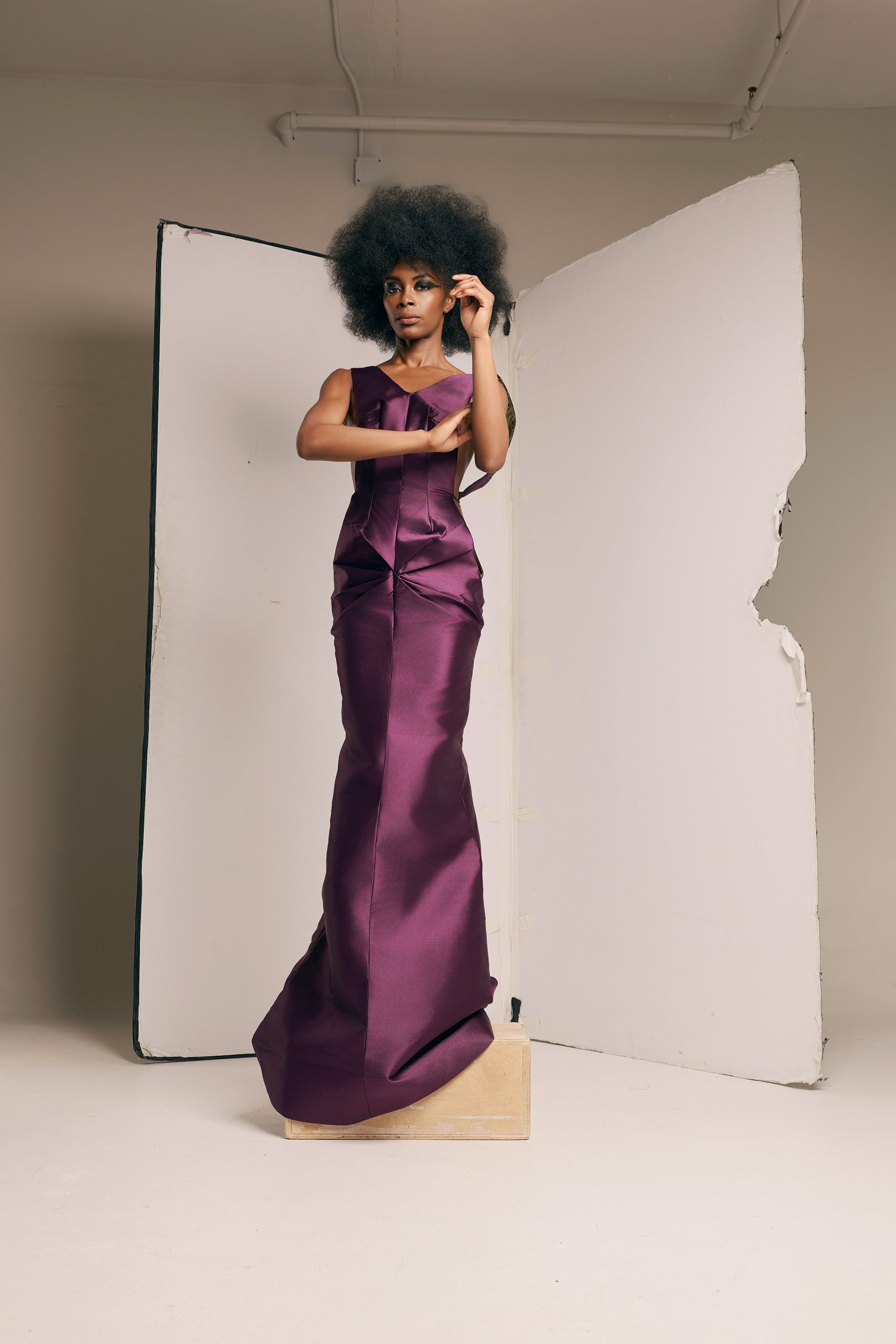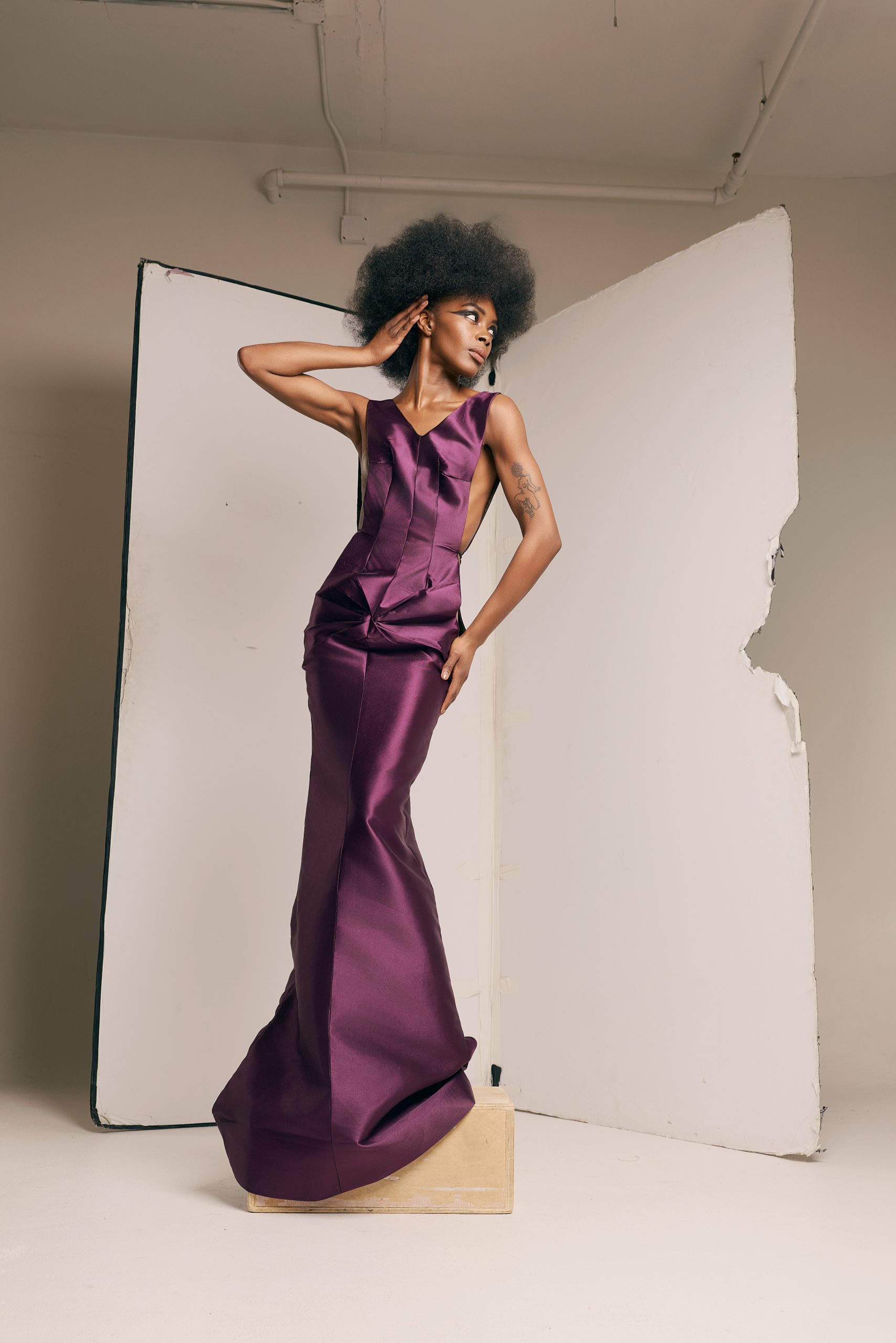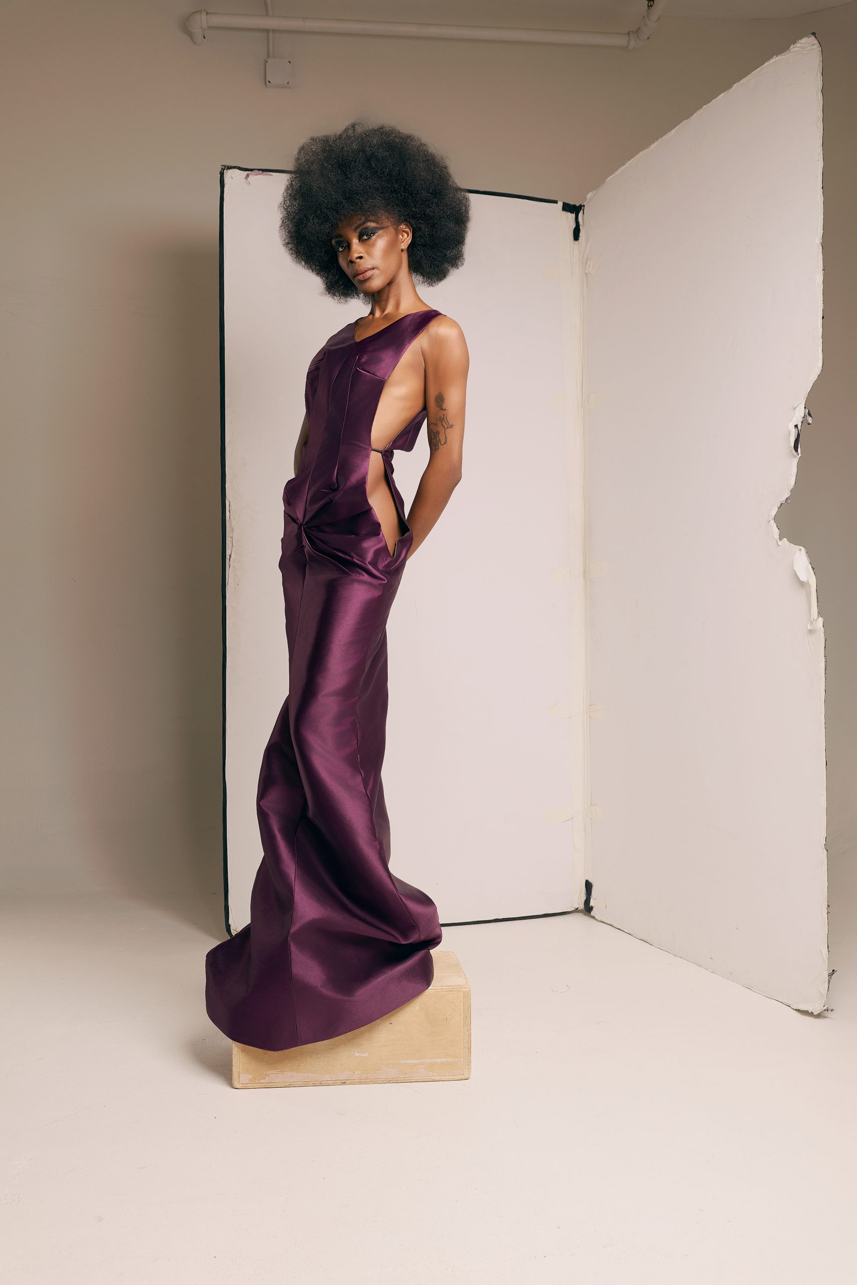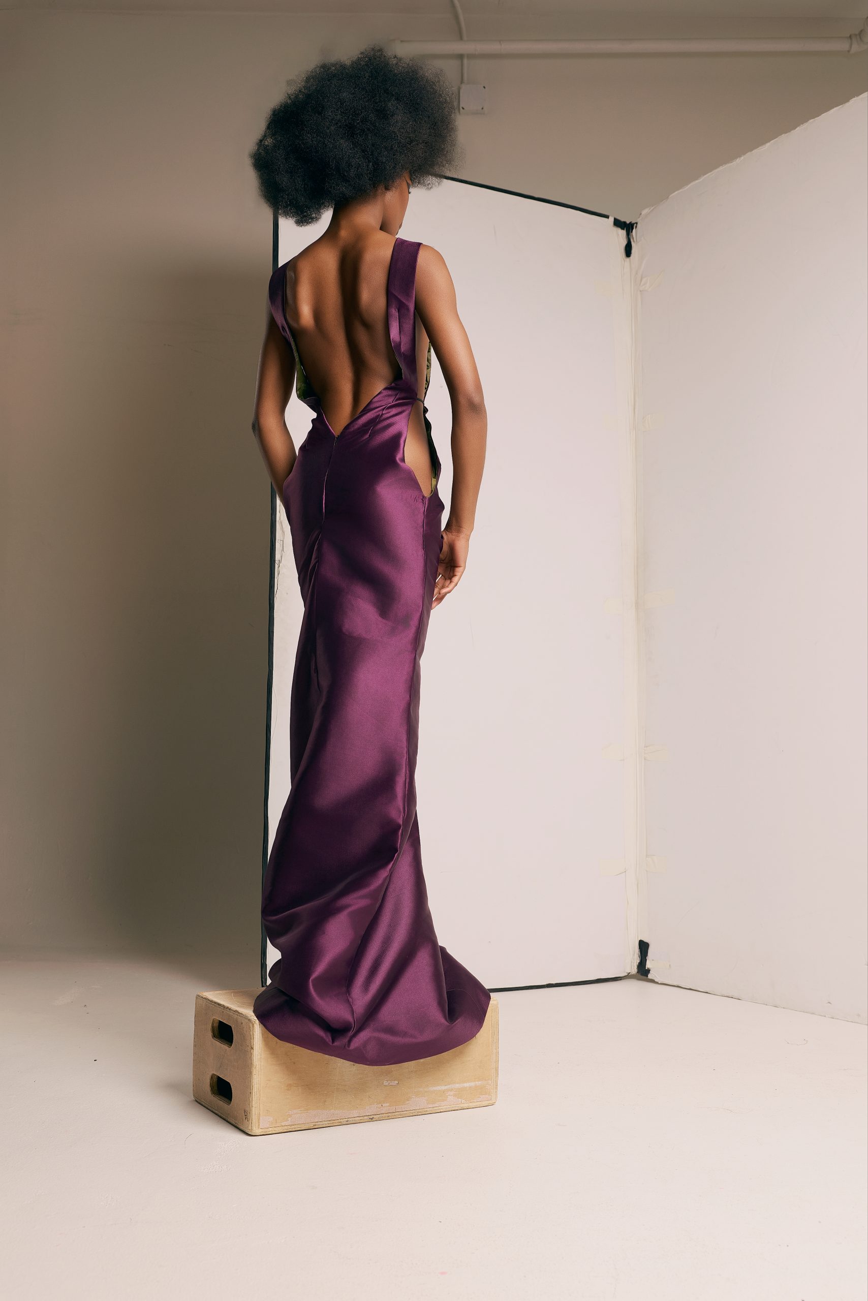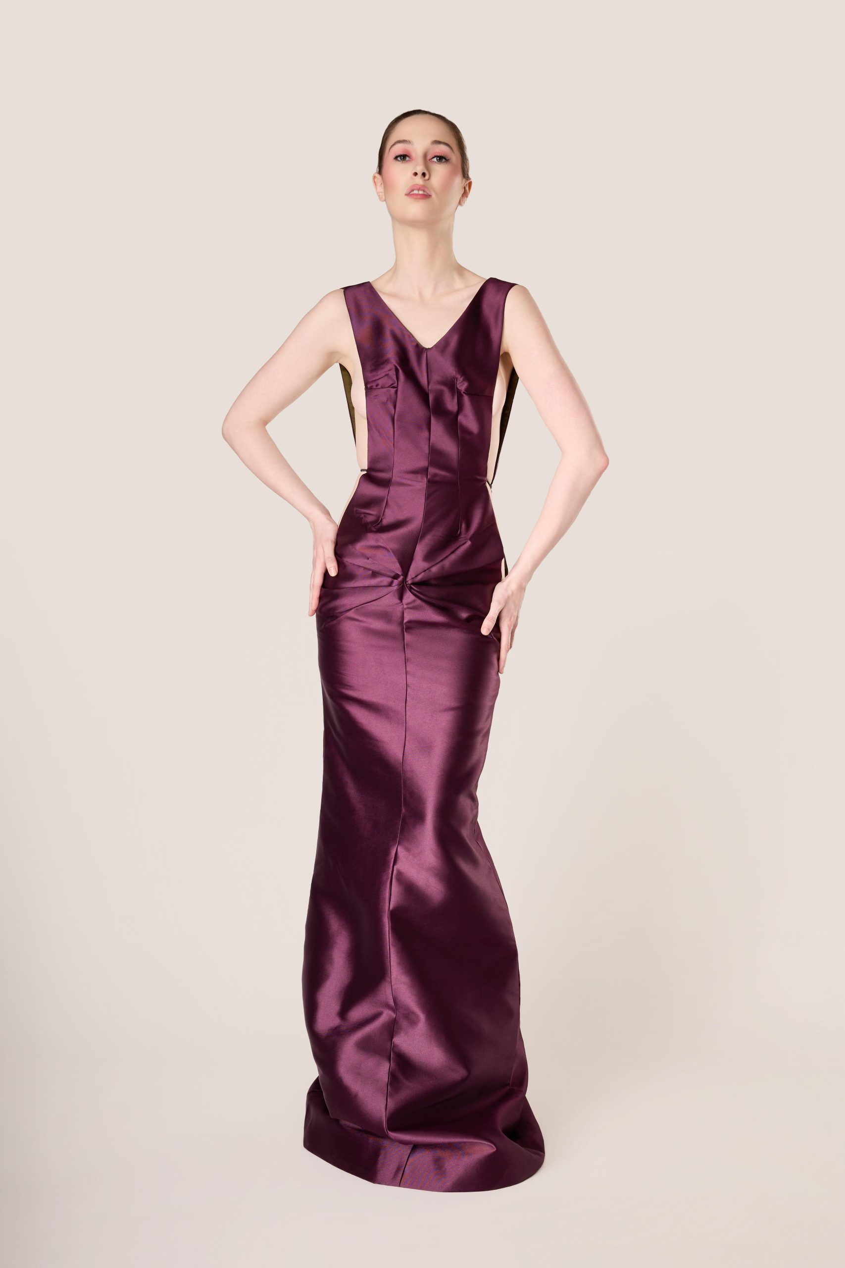 Mikado silk blend (aubergine). Open back with adjustable crossover strap closure.