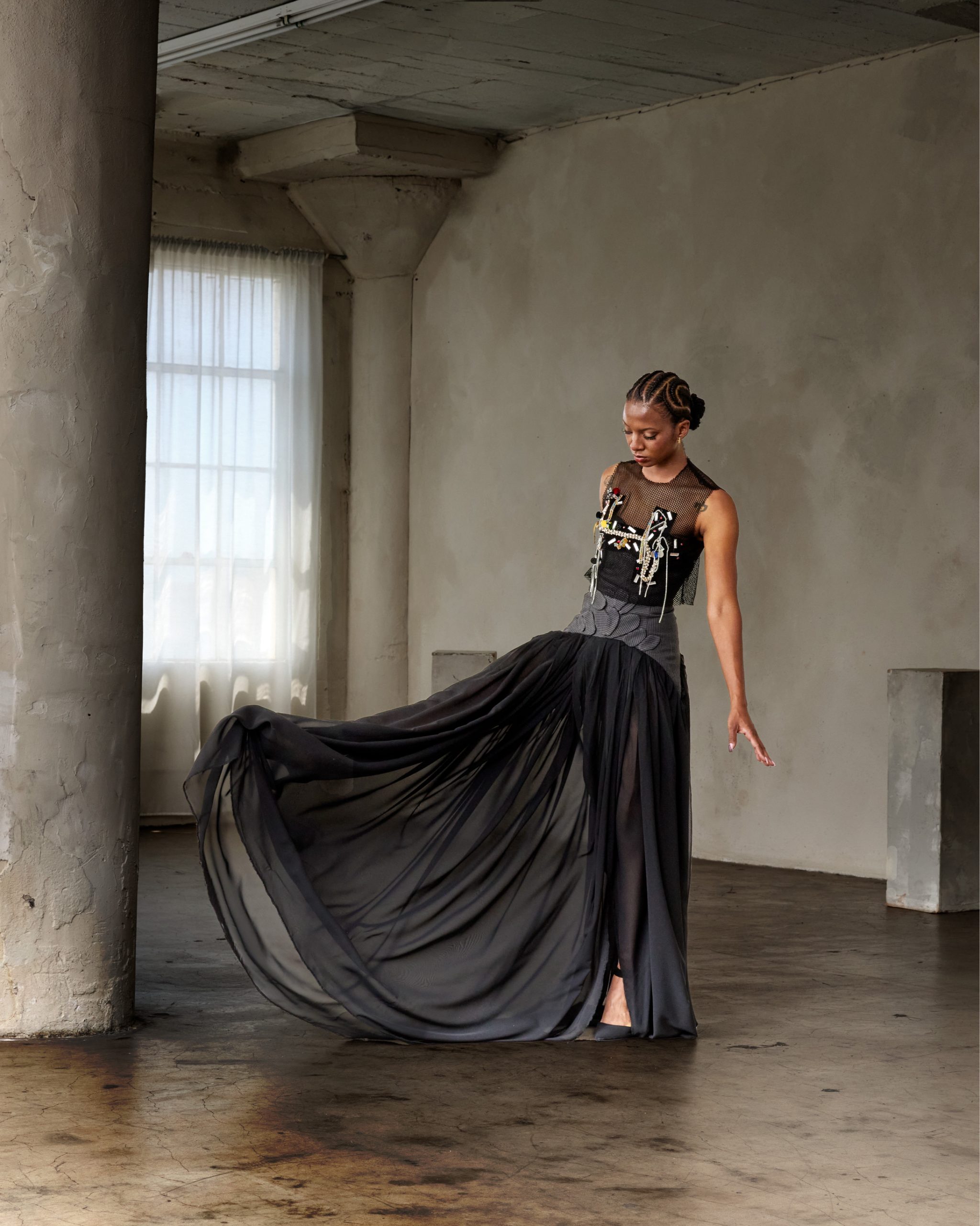Below, a patterned waist panel transitions into a long skirt of sheer black chiffon, the weight of the ornamentation above giving way to something almost weightless. This luxury handcrafted gown draws directly from the tradition of Yoruba ceremonial dress. Part of the Homecoming FW25 collection by Joseph Ejiro.