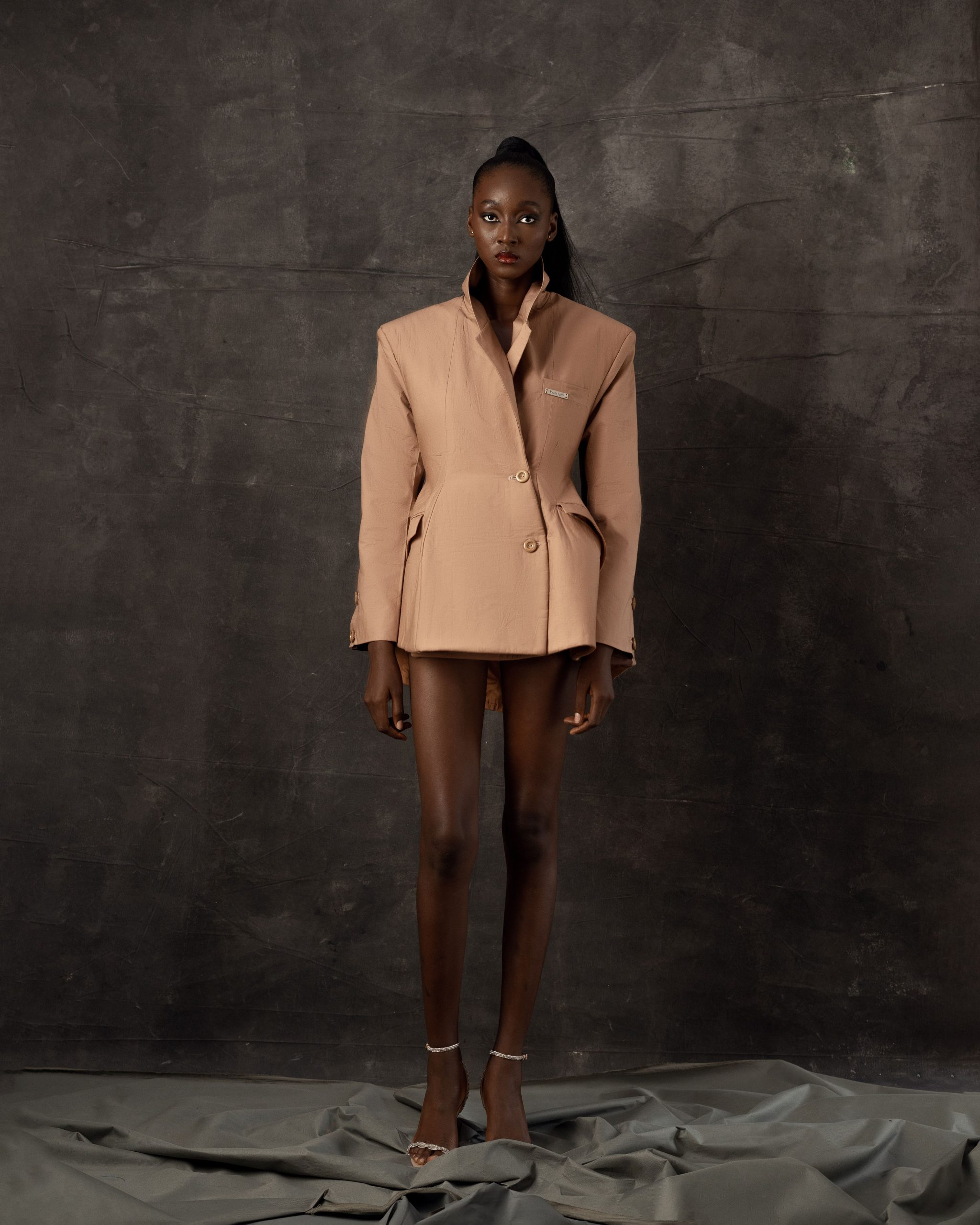 The Beige Cotton Blazer is an exercise in considered minimalism. Constructed from 100% pure cotton in a warm, neutral beige, it draws its strength from precision tailoring rather than ornamentation. The sharp, structured shoulders create a confident silhouette, while the distinctive stand collar reinterprets the classic notch lapel through a more architectural lens. The fit is intentionally oversized yet cut close enough to remain sophisticated rather than casual, striking the balance between ease and authority that defines the Joseph Ejiro approach. Patch pockets sit flush against the body, maintaining the clean lines that make this piece as relevant at a business meeting as at an evening event. This is a capsule wardrobe cornerstone built to last far beyond a single season.
