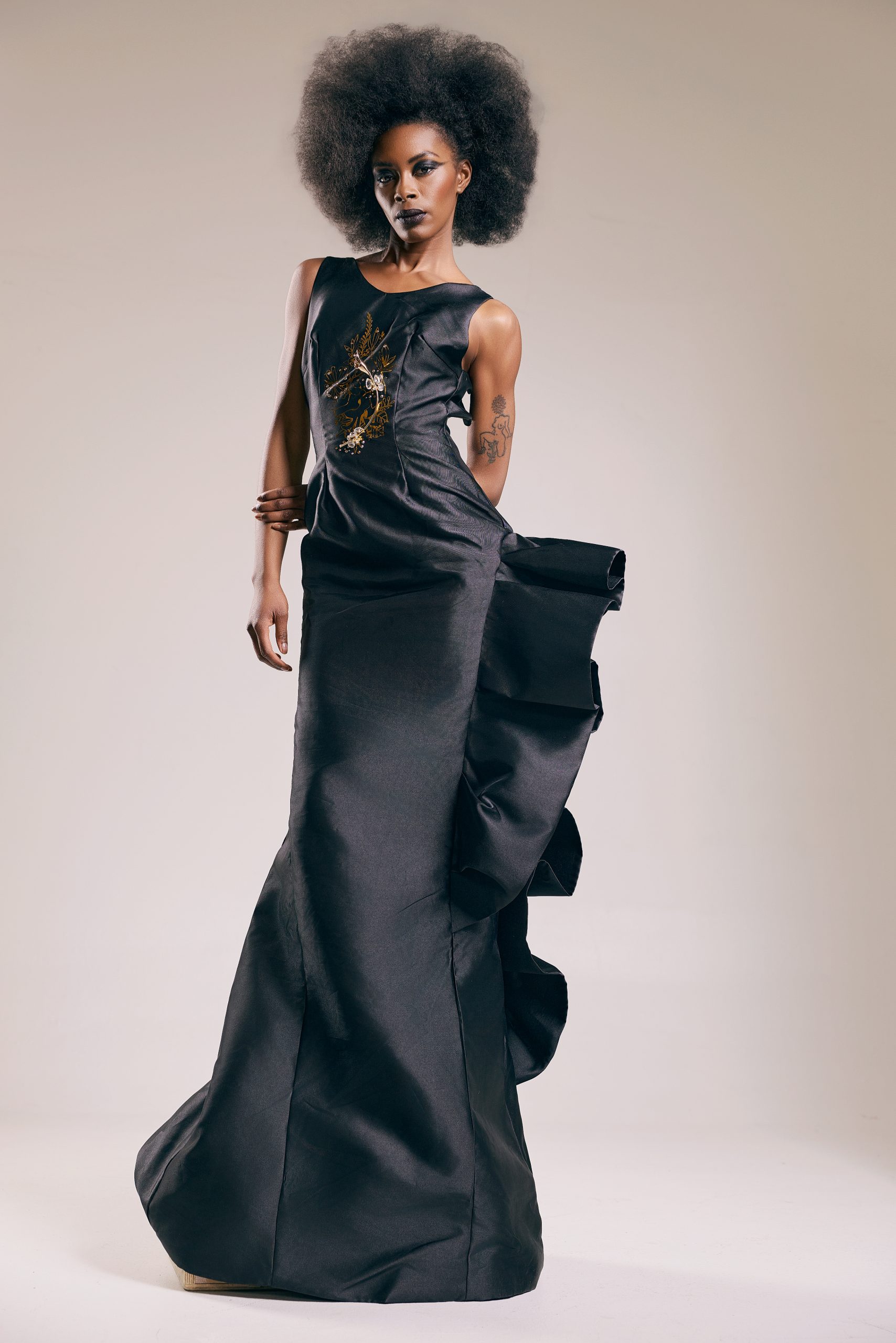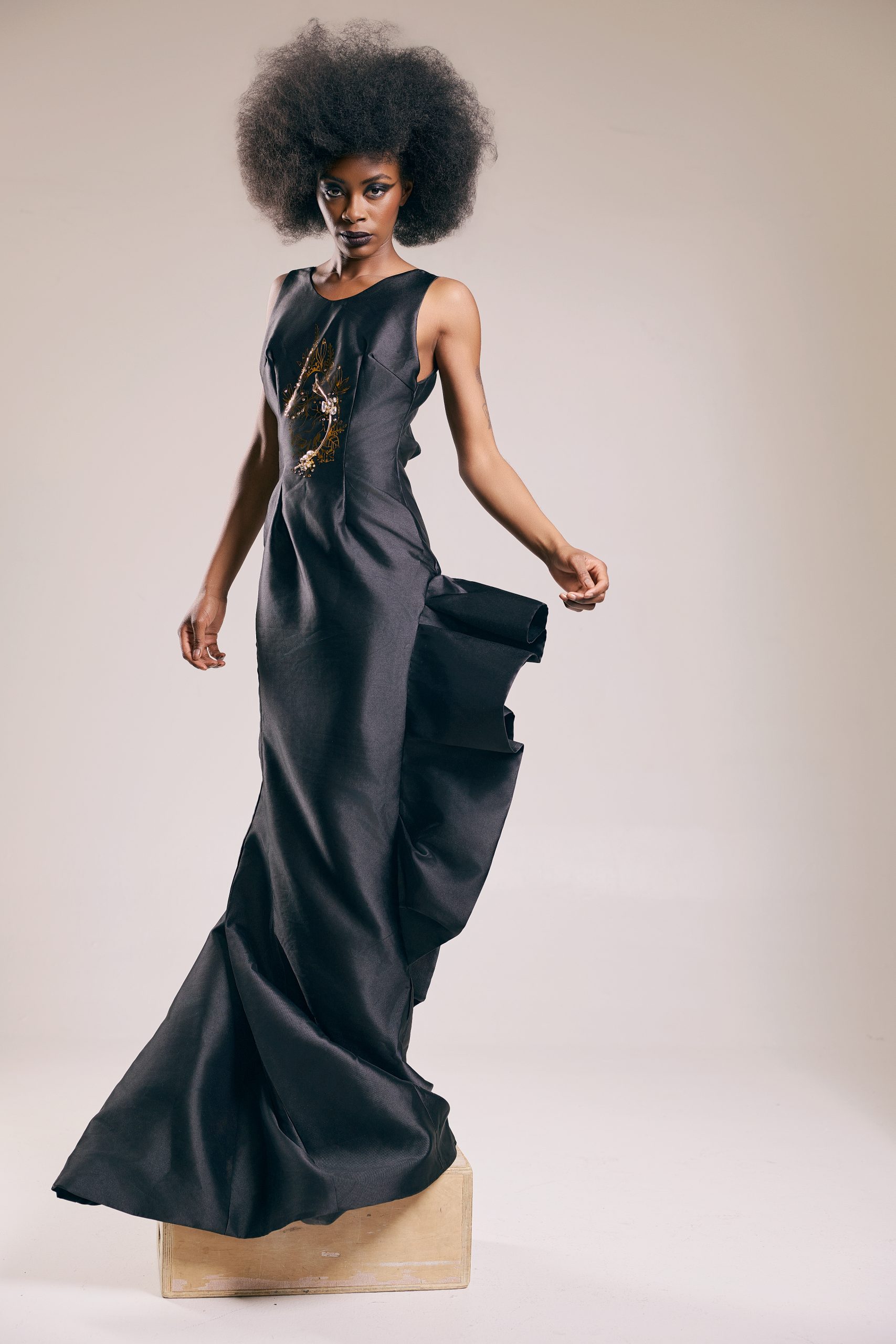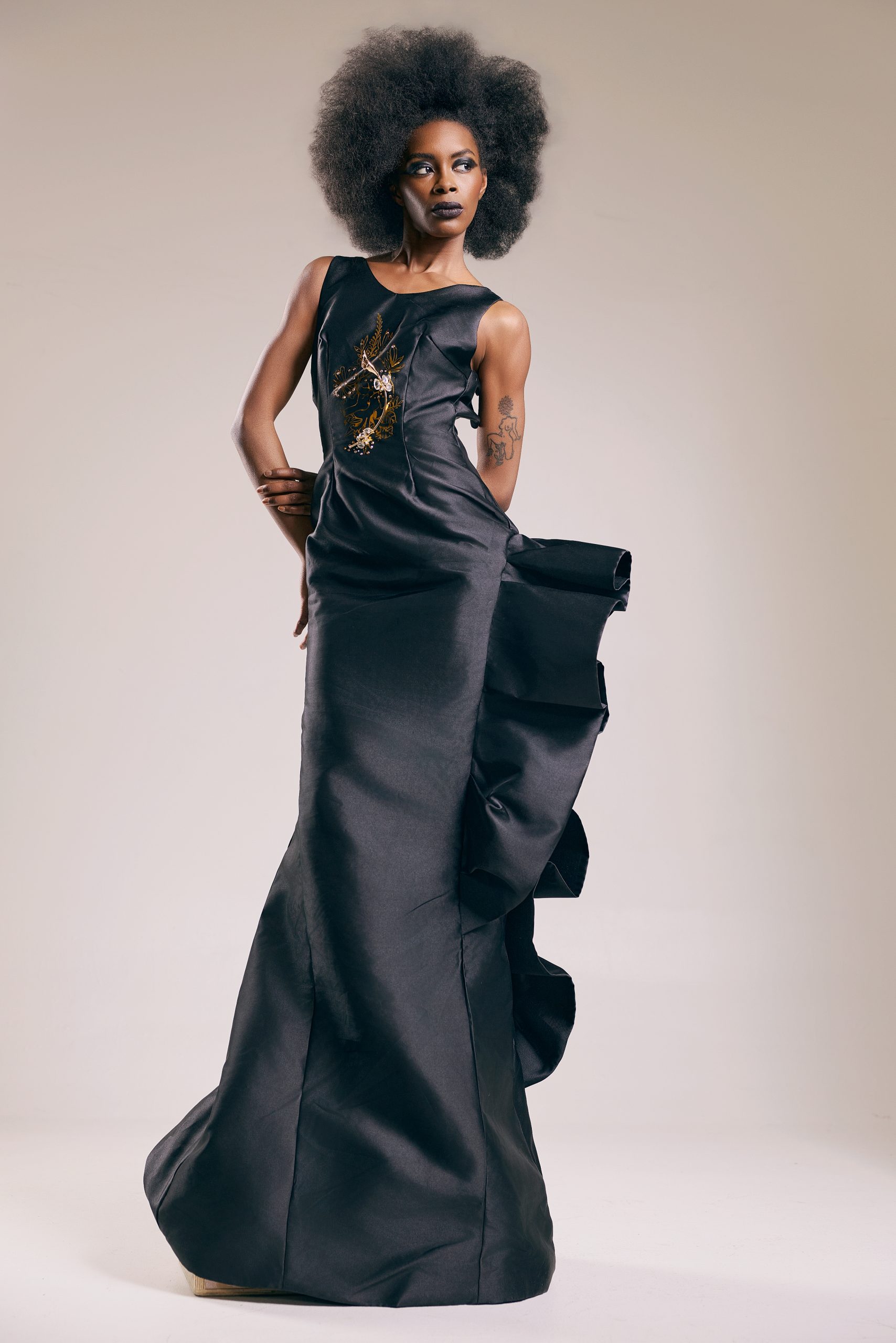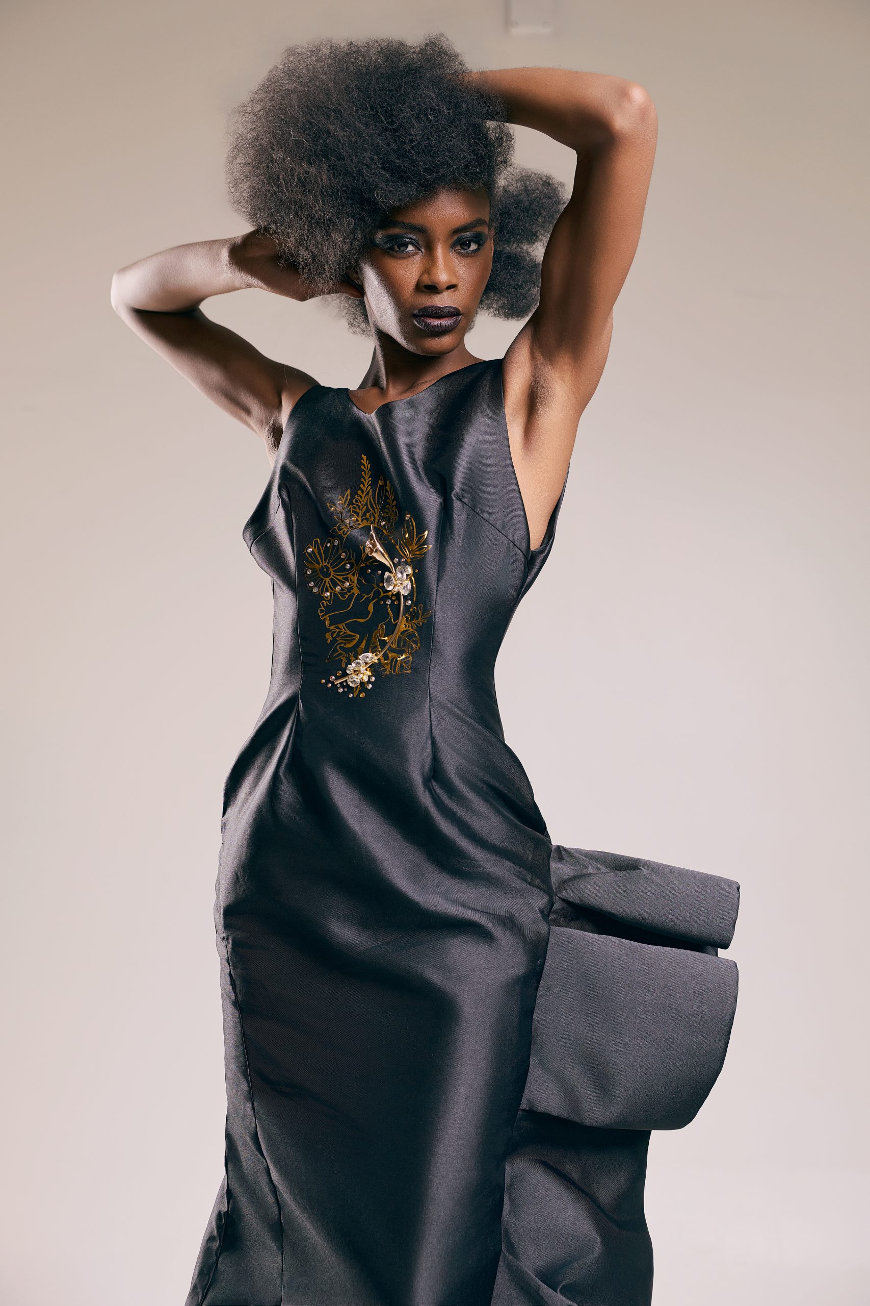 Heavyweight Mikado silk blend (black). Tonal hand embroidery throughout bodice.