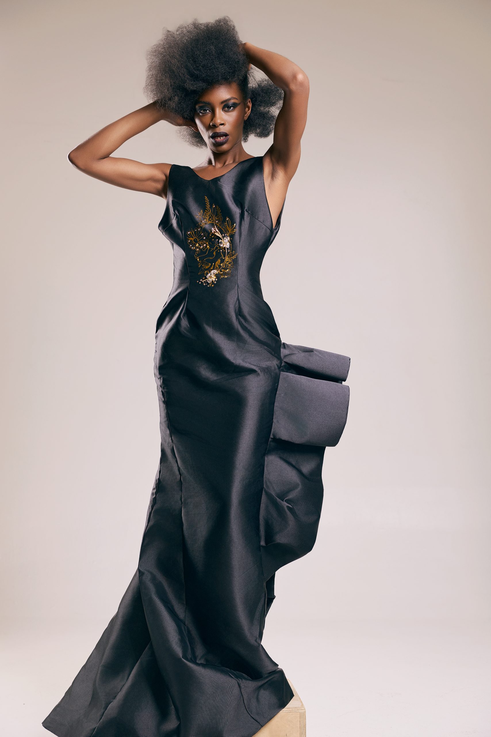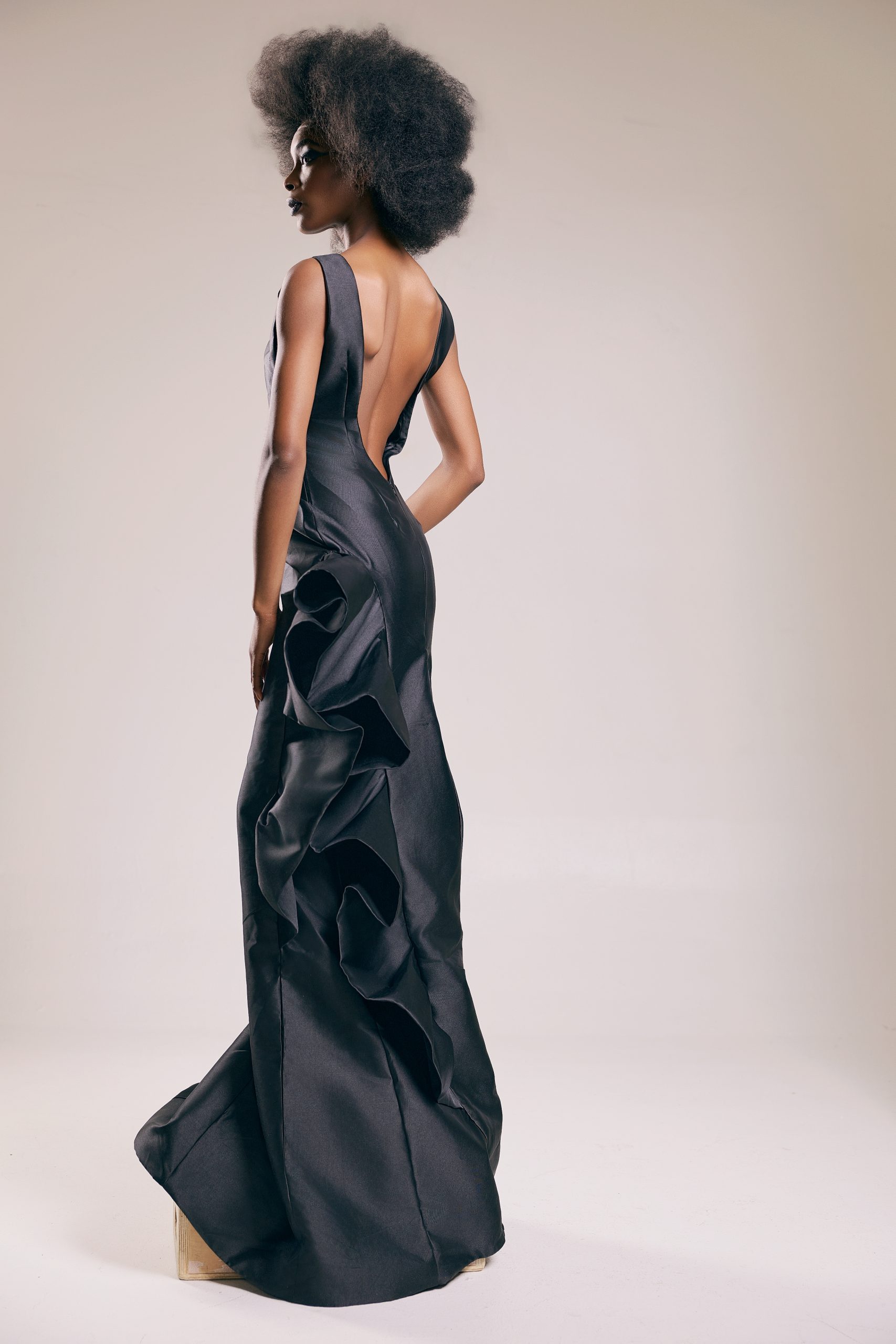 A draped halter neckline opens to a deeply cut open back, the spine fully revealed. Tonal hand embroidery traces the bodice with the precision of a drawn mark, each stitch placed by hand in the Joseph Ejiro atelier.
