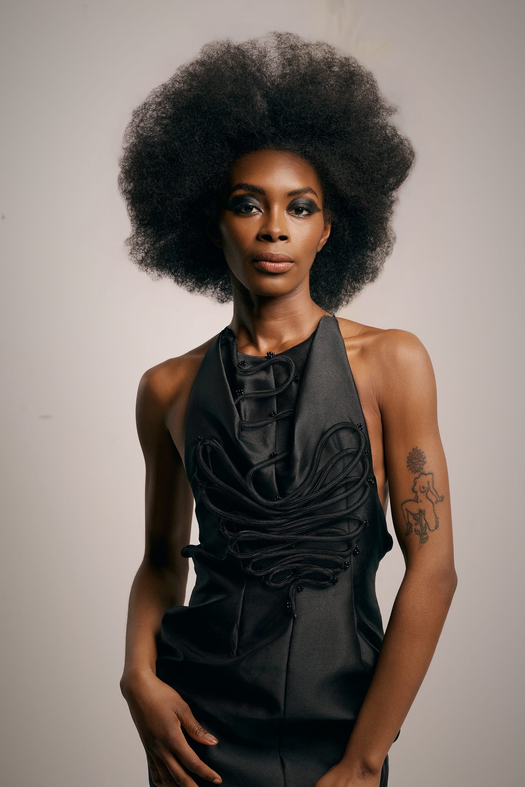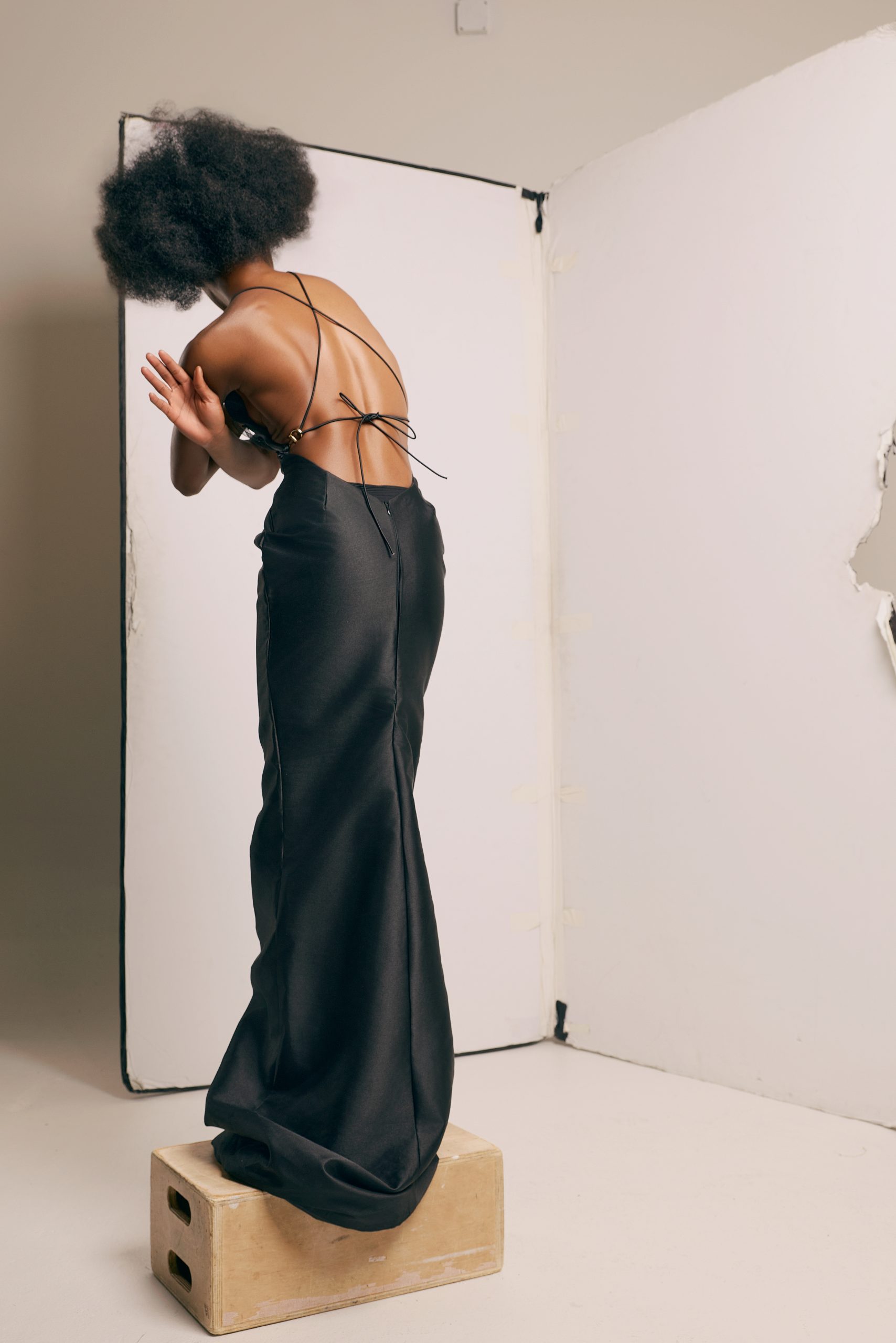 A halter neckline draws the eye upward while the column fall grounds the garment in absolute simplicity. The open back is clean and precisely cut, framed by two thin straps. The Mikado silk blend moves with controlled weight, resisting excess while retaining enough fluidity to breathe.