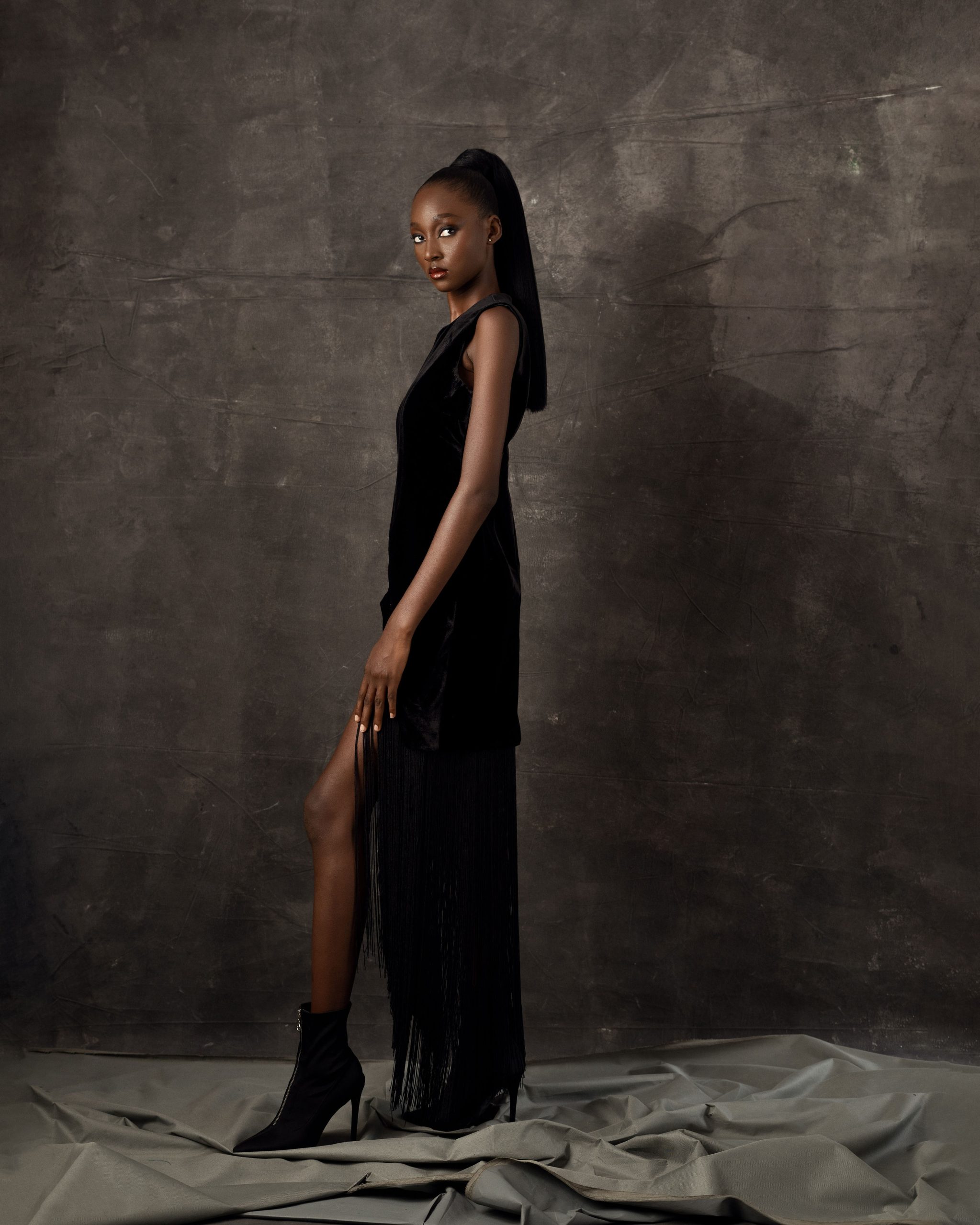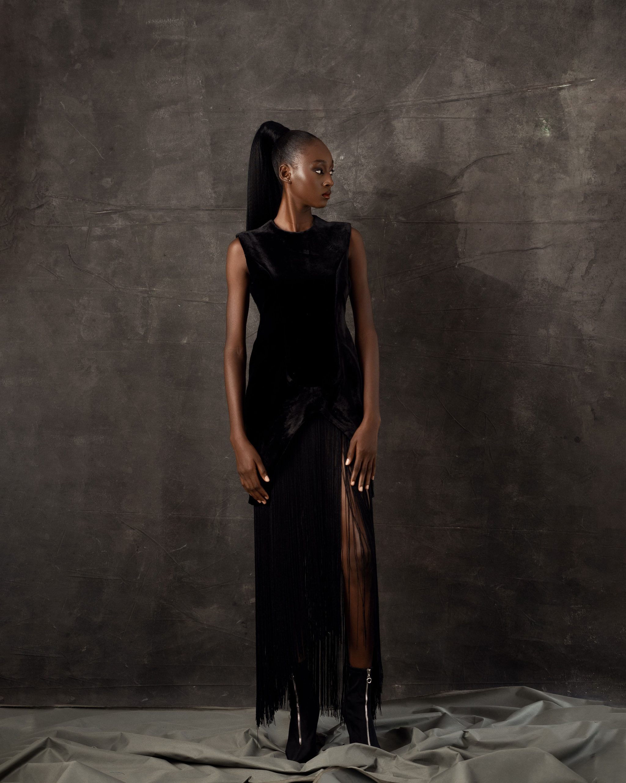 Korean velvet is distinguished from European velvet by its weight and the particular way it moves: denser and more liquid, with a pile that catches light in deep, shifting pools of shadow and shine. This sleeveless column dress makes full use of those properties by keeping the design itself minimal: a clean neckline, an almost imperceptible side seam, and a hemline that sits at the ankle. The single design gesture is the fringe detail that runs from mid-hip to the hem, constructed from hundreds of individual strands of matching velvet ribbon that sway and separate with movement, giving the lower half of the dress a kinetic quality that contrasts beautifully with the stillness of the upper half. The result is a dress that is at once minimal and dramatic, controlled and alive, exactly the kind of considered contradiction that defines the Héritages Croisés aesthetic.