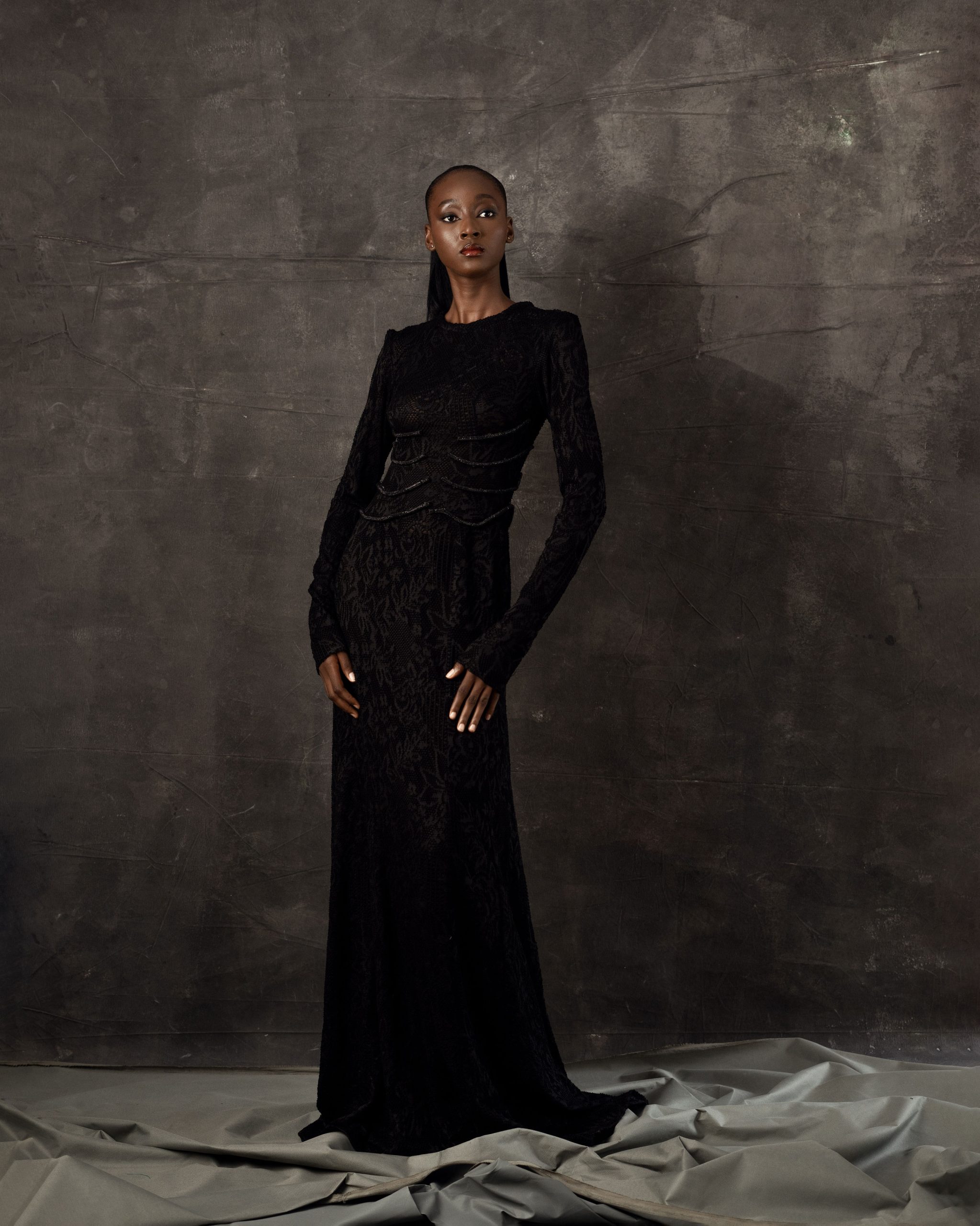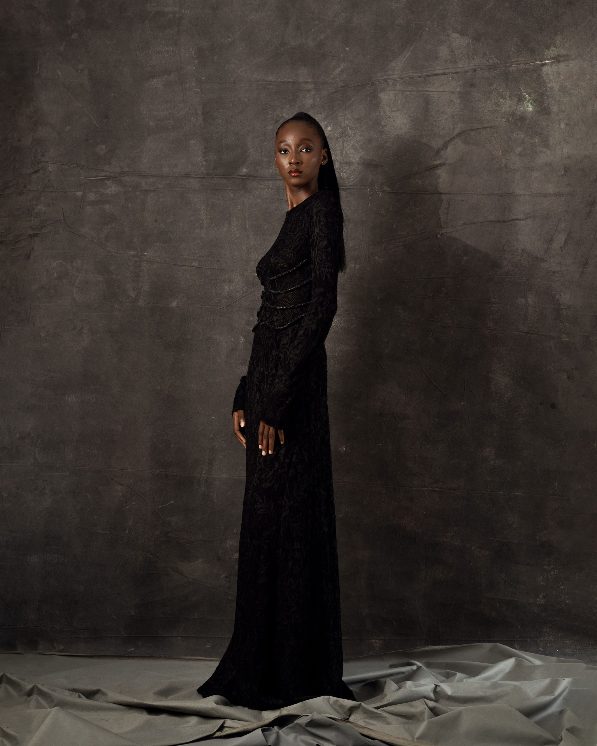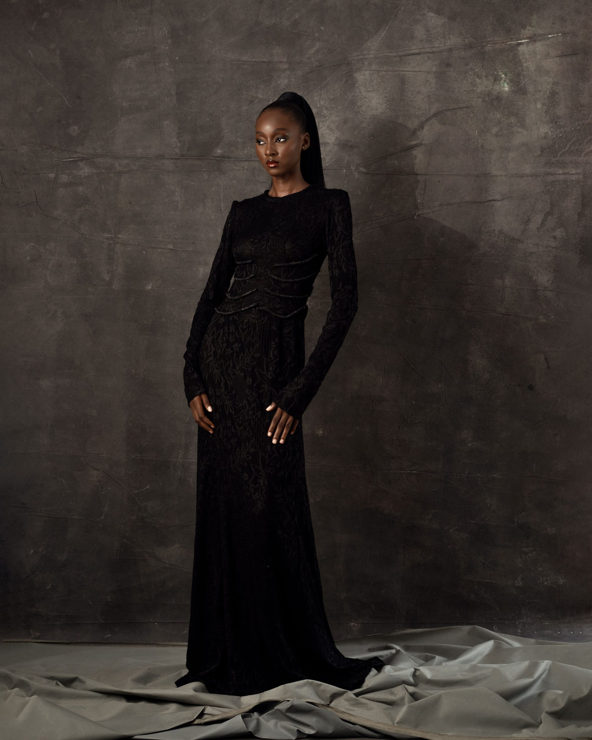 Lace is among fashion’s most storied materials, carrying centuries of associations with ceremony, status, and femininity. This full-length gown engages that history while fundamentally reframing it through a contemporary lens. The lace is a heavyweight, all-over pattern in deep black, with a dense floral repeat that creates an effect somewhere between transparency and opacity depending on how light falls across it. The gown is long-sleeved and high-necked at the front, presenting a silhouette of austere elegance. The revelation comes at the back: a deep open backline that descends to the small of the back, edged precisely by the lace and framed by a chain detail that crosses the exposed skin. This tension between restraint and exposure is the emotional core of the piece. Worn to black-tie events or any occasion that calls for presence.