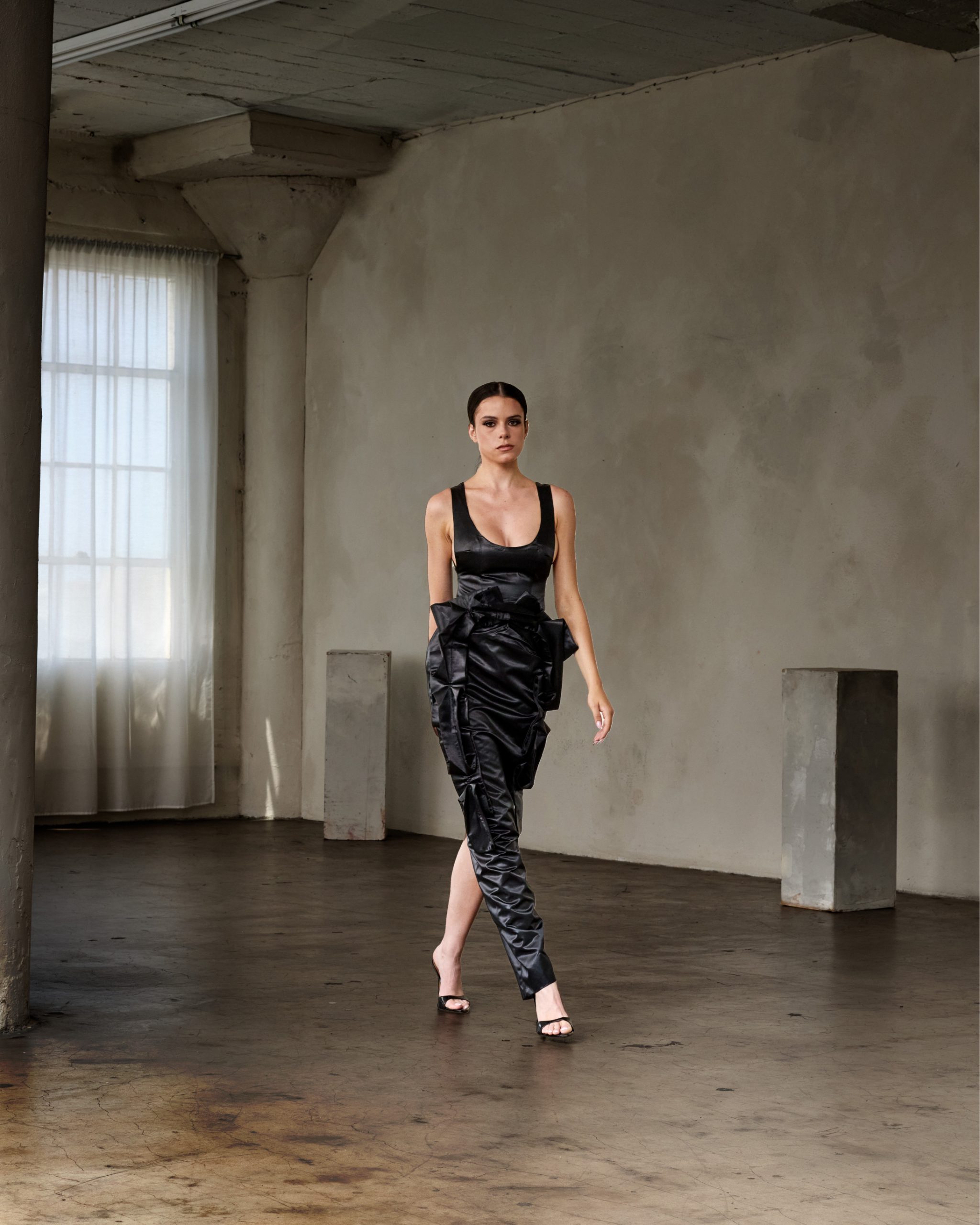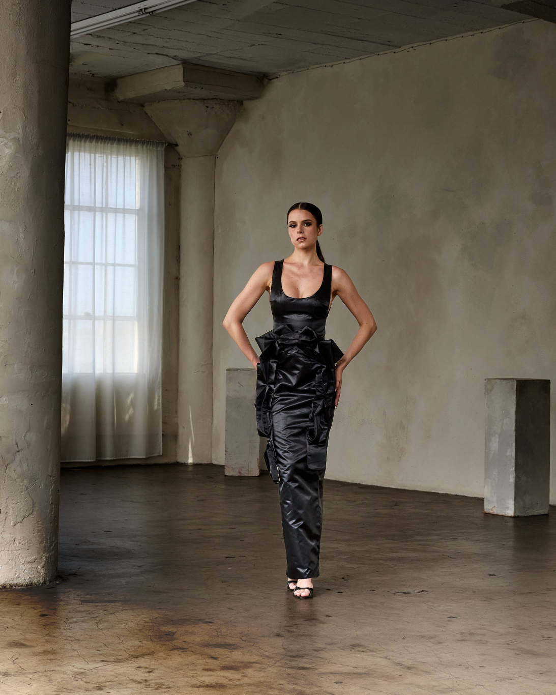 Heavyweight Mikado silk blend (black). Scoop neckline. Hand-constructed deconstructed hip ruffle. Floor-length column.