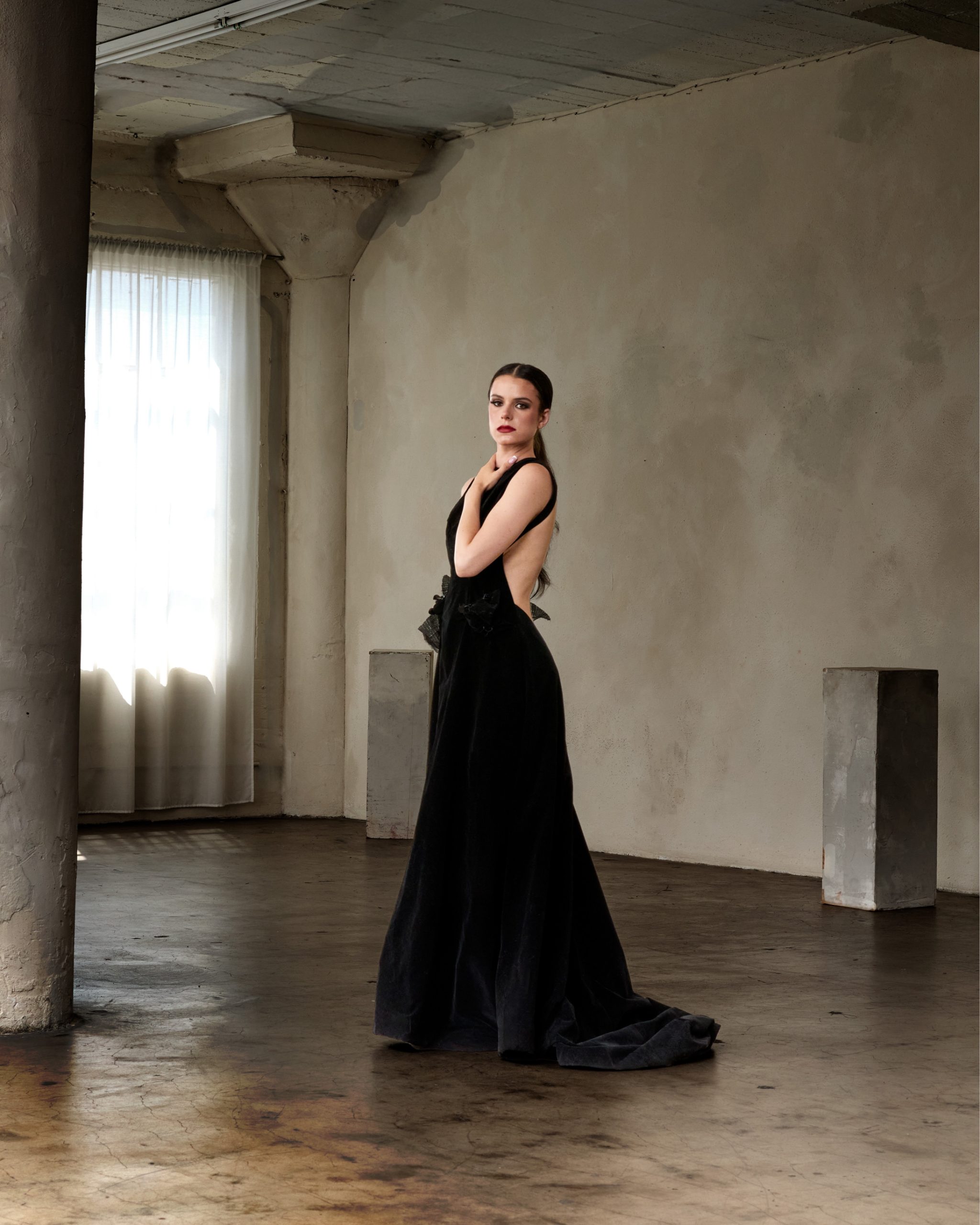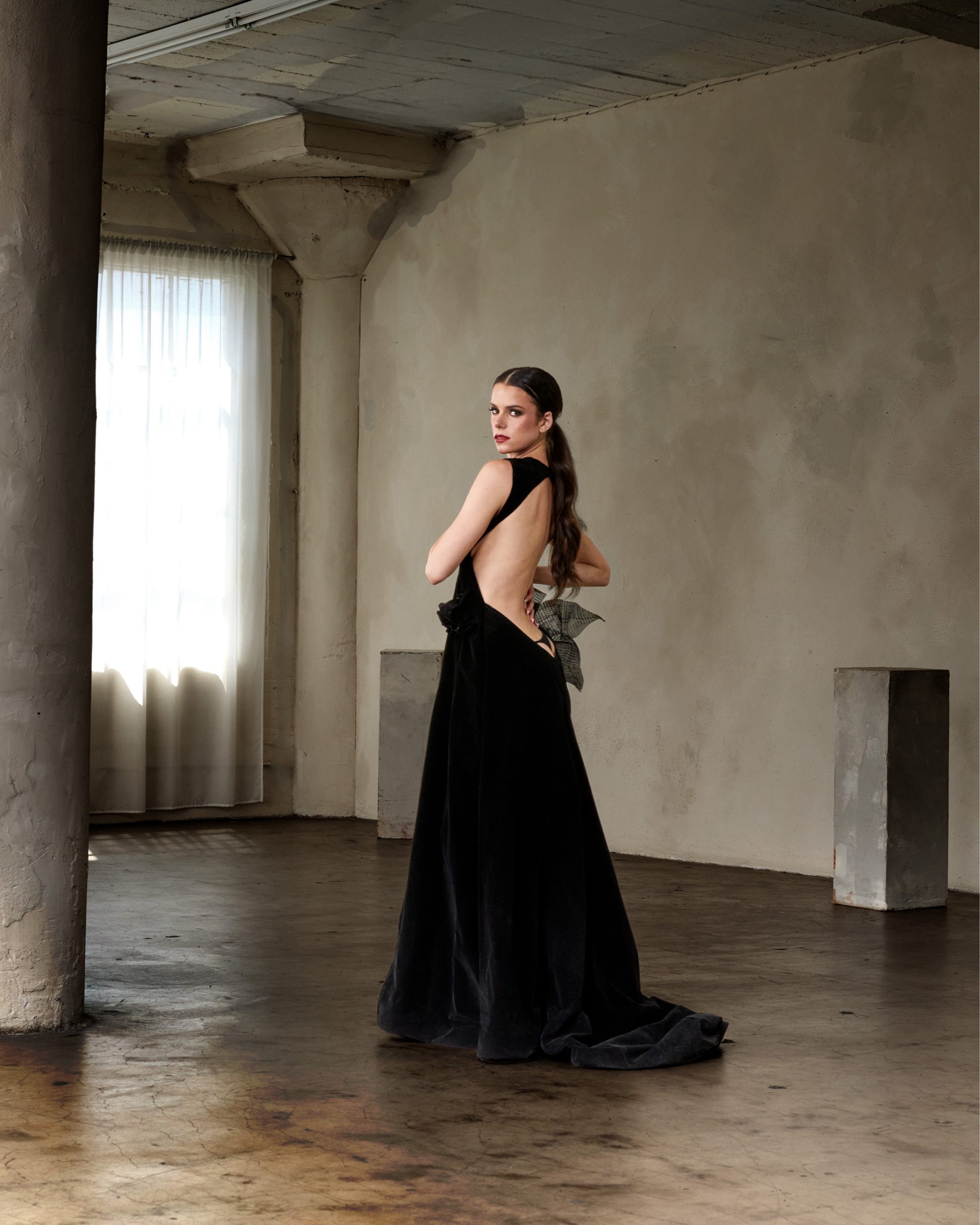 Deep black velvet is cut into a sleeveless A-line of unhurried elegance, a high neckline and floor-sweeping skirt establishing an architectural quietness that the back then refuses. There, a breathtakingly deep open scoop reveals the full length of the spine, anchored at its base by a sculptural wing-like applique that reads as both ornament and structural punctuation.