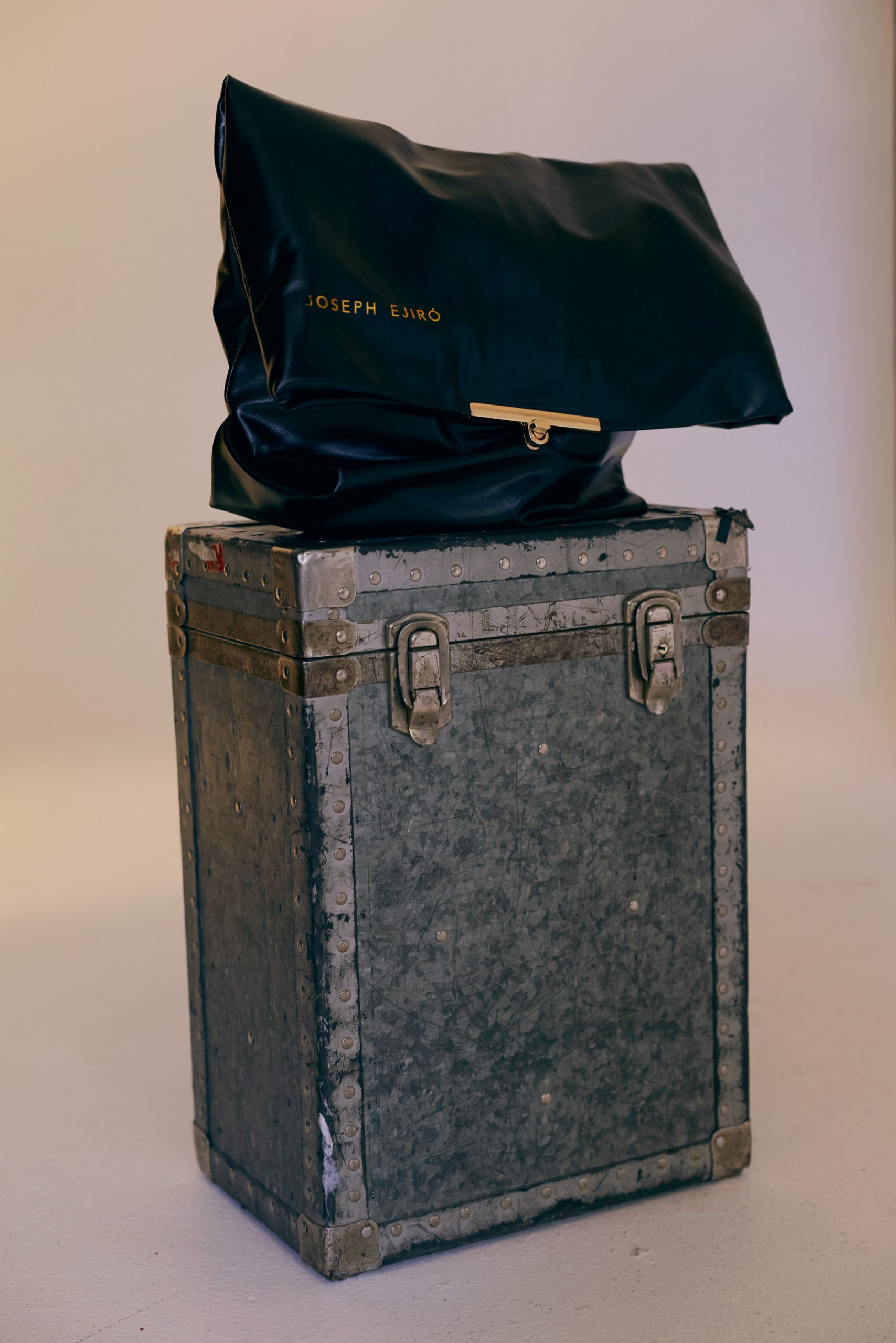 The Foldover Clutch in Midnight Black, shown here in its fully closed and draped position. Constructed from smooth faux leather, this shot lets the natural fall of the fold take centre stage — the material gathers generously at the top, the brand name rests quietly in gold on the lower left, and the overall silhouette reads as soft and considered. It is the same bag as JE-BAG-001, the same faux leather construction and gold hardware — simply captured at a different moment in how it sits and is carried.