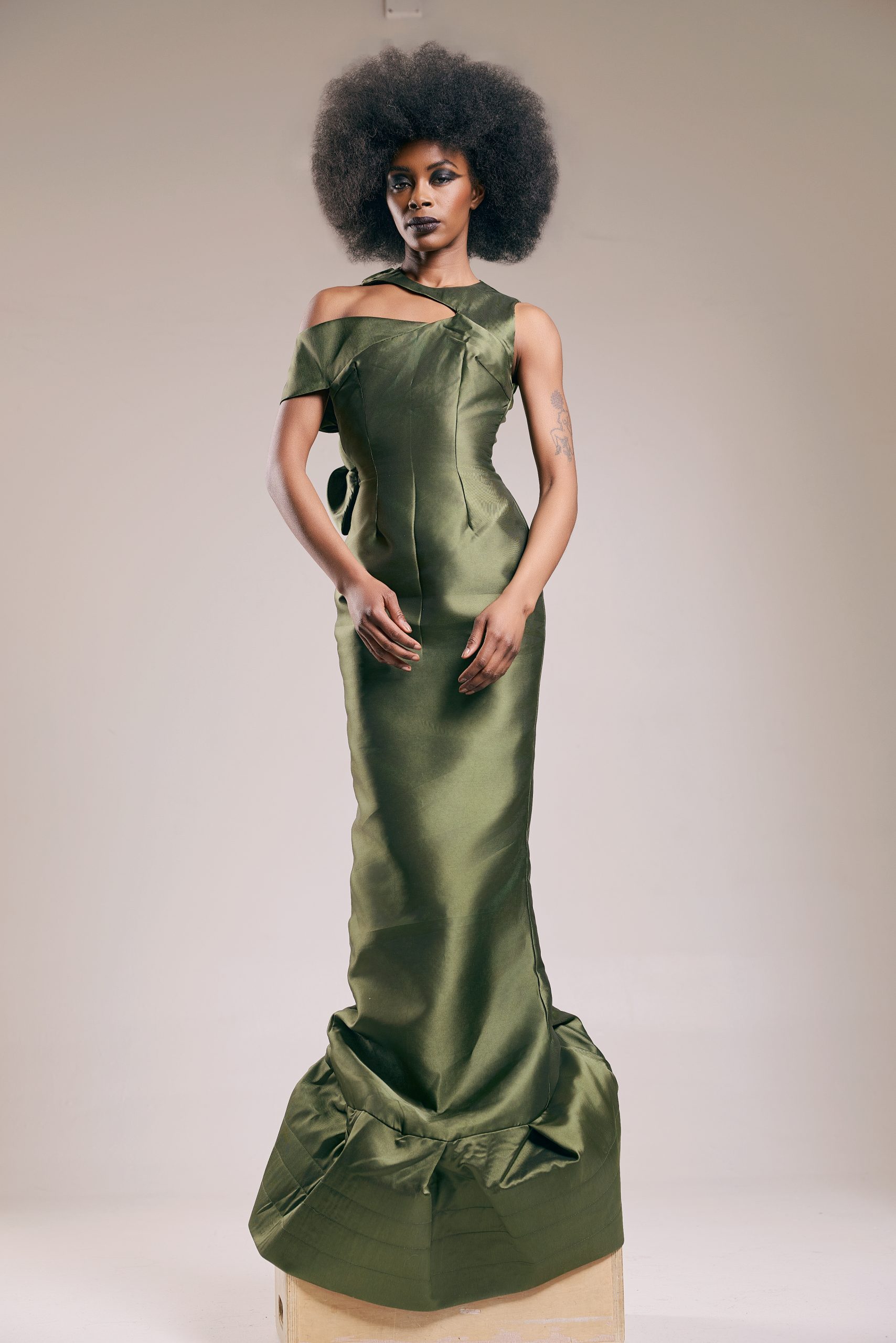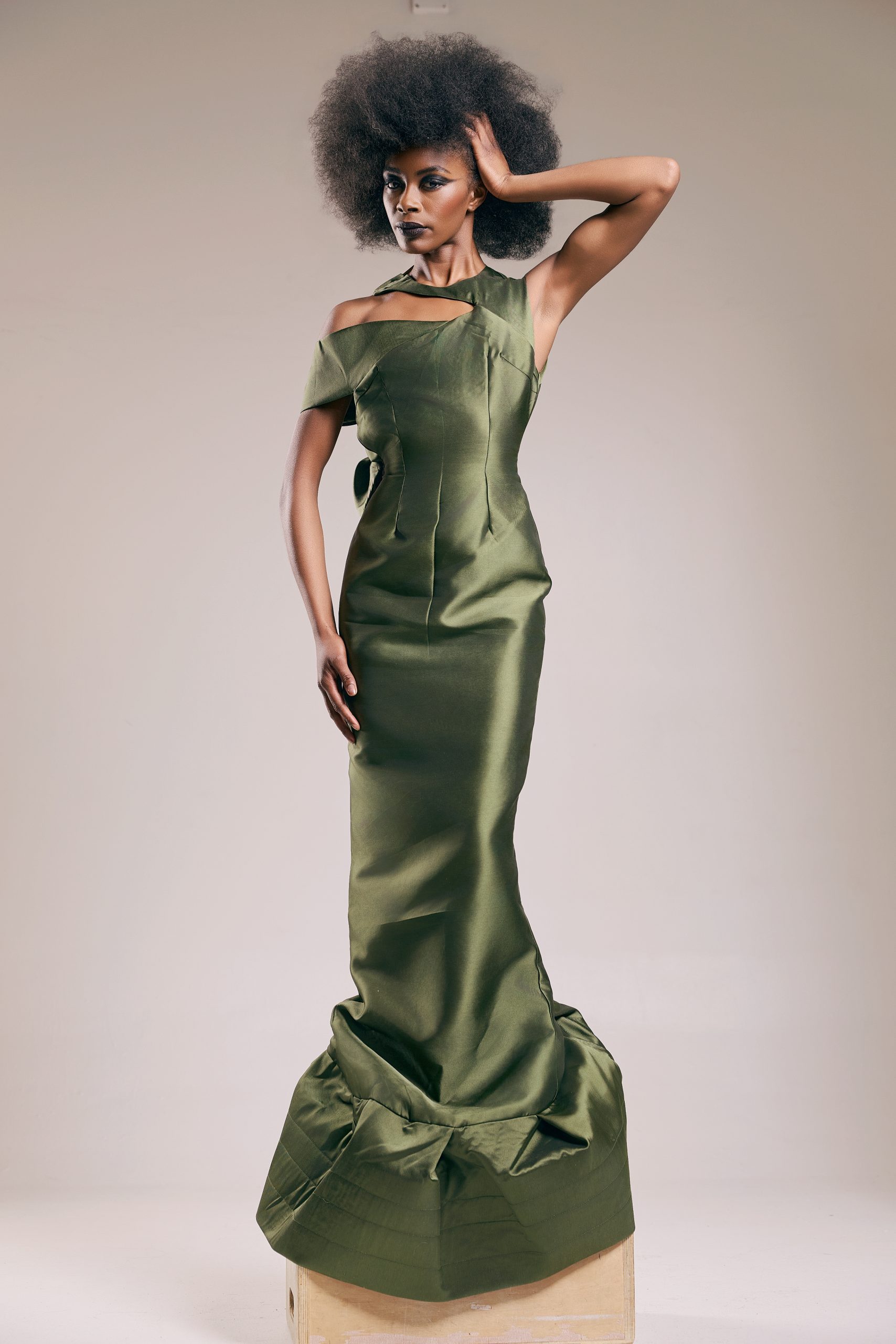 The one-shoulder collar rises from the neckline and extends outward in a geometric cutout form, framing the shoulder and collarbone in a gesture drawing from modernist fashion history and the ceremonial shoulder dressing of West African dress traditions.