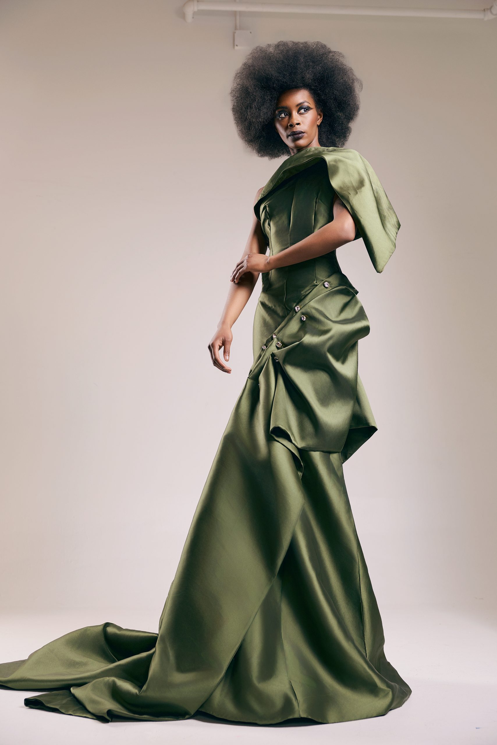 Heavyweight Mikado silk blend (forest green). Architectural one-shoulder bow, ceremonial button detail, floor-length pooling train. Made to measure exclusively.