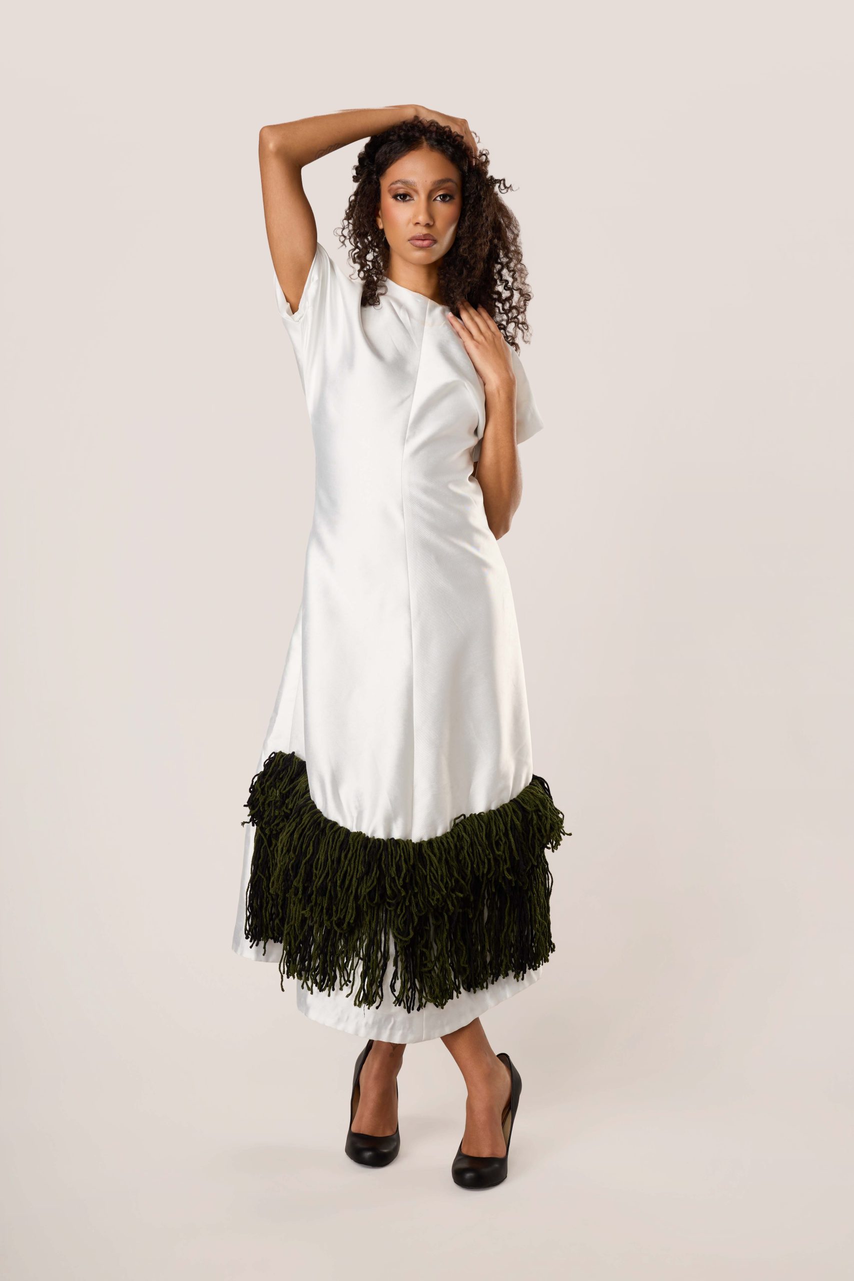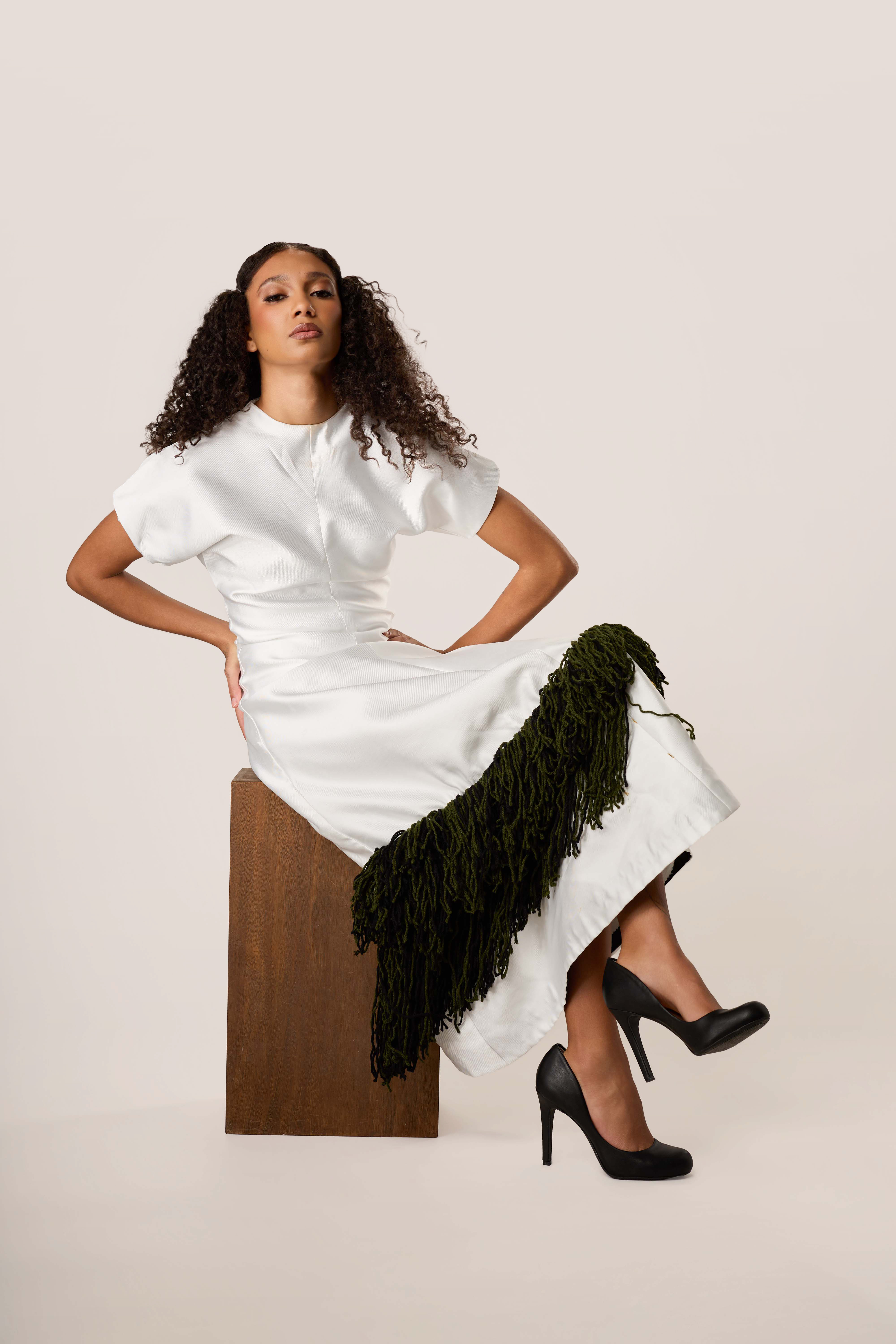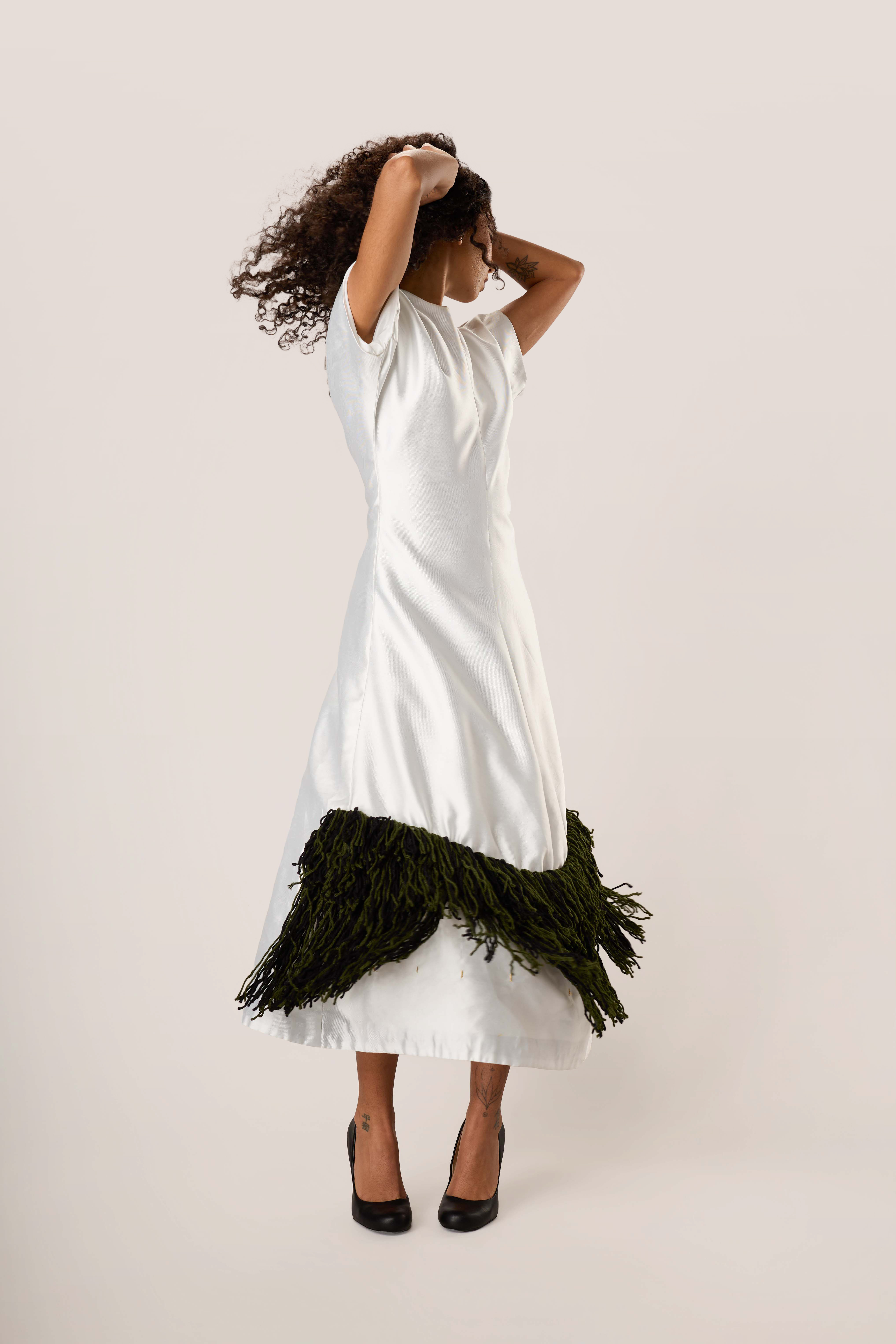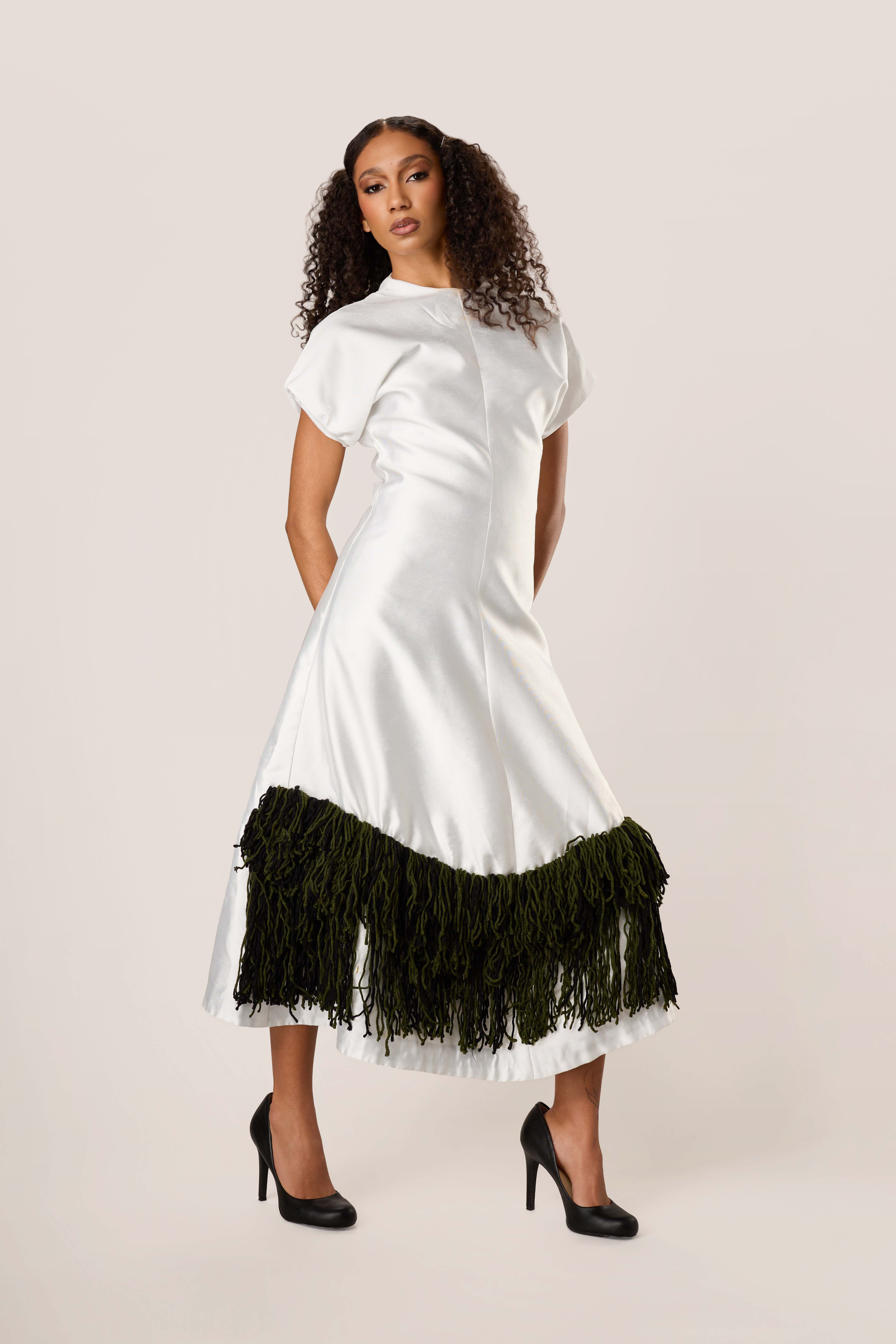 This is a piece about cultural weight carried lightly. The structured ivory body falls to a midi length. At the hem, a generous double layer of deep forest green fringe echoes the cadence of ceremony cloth.