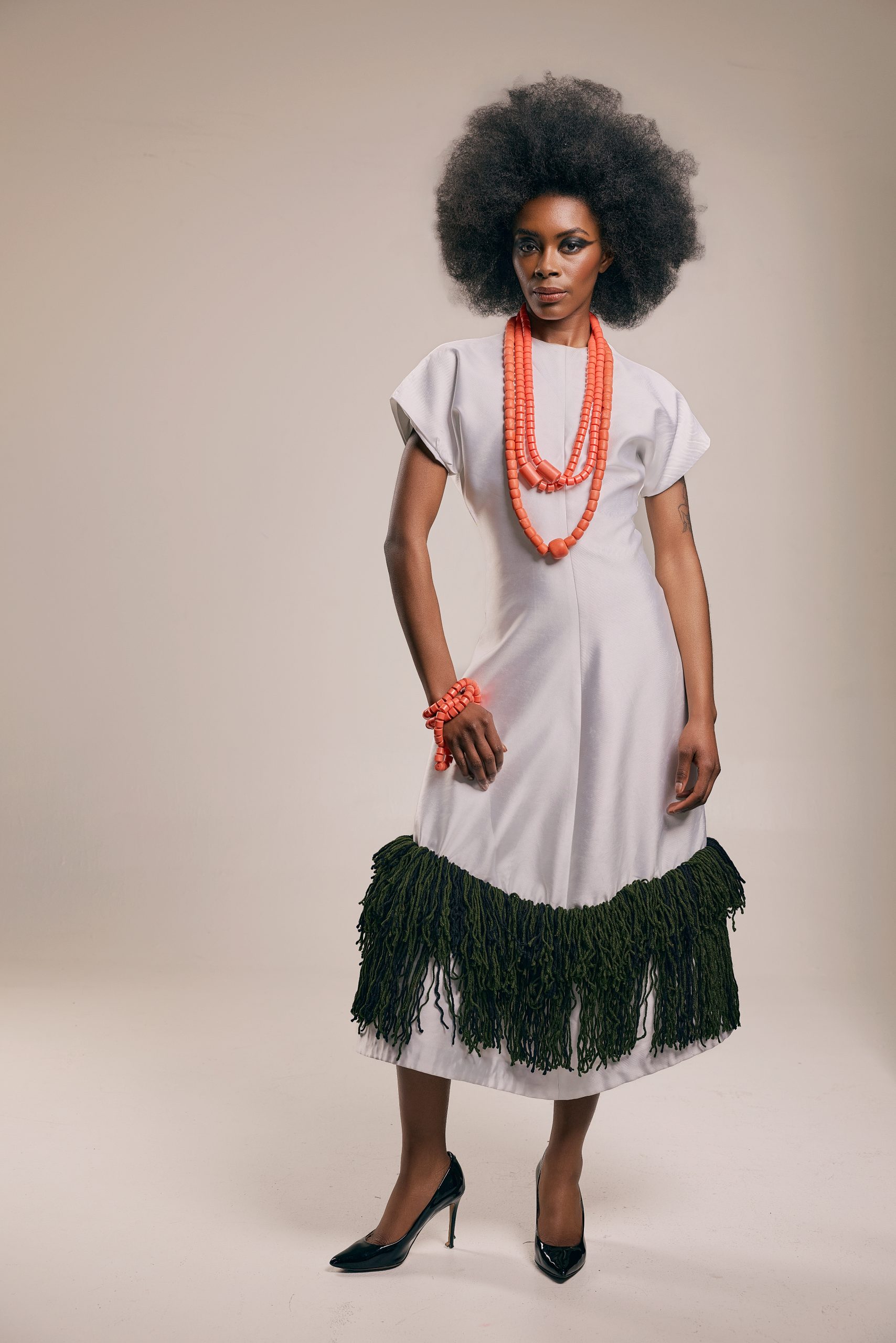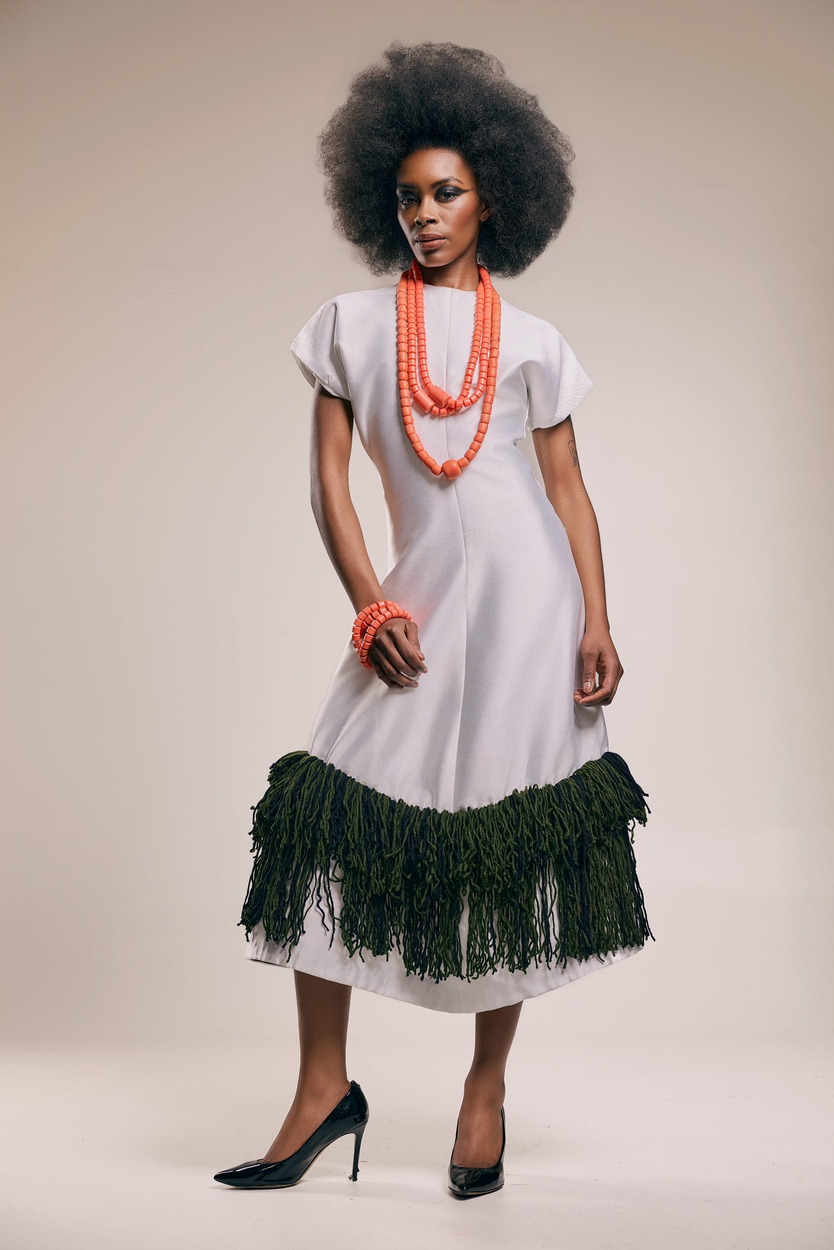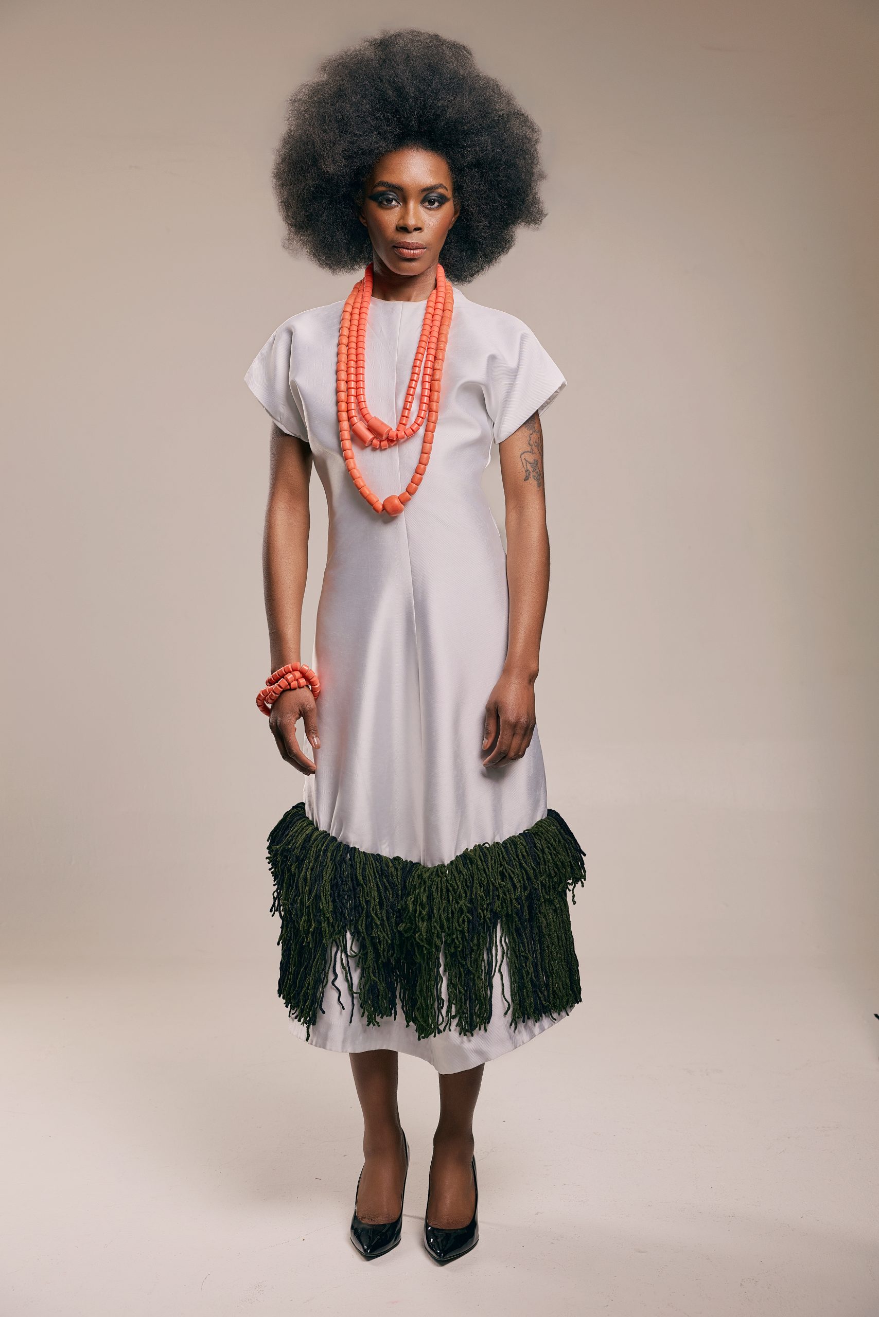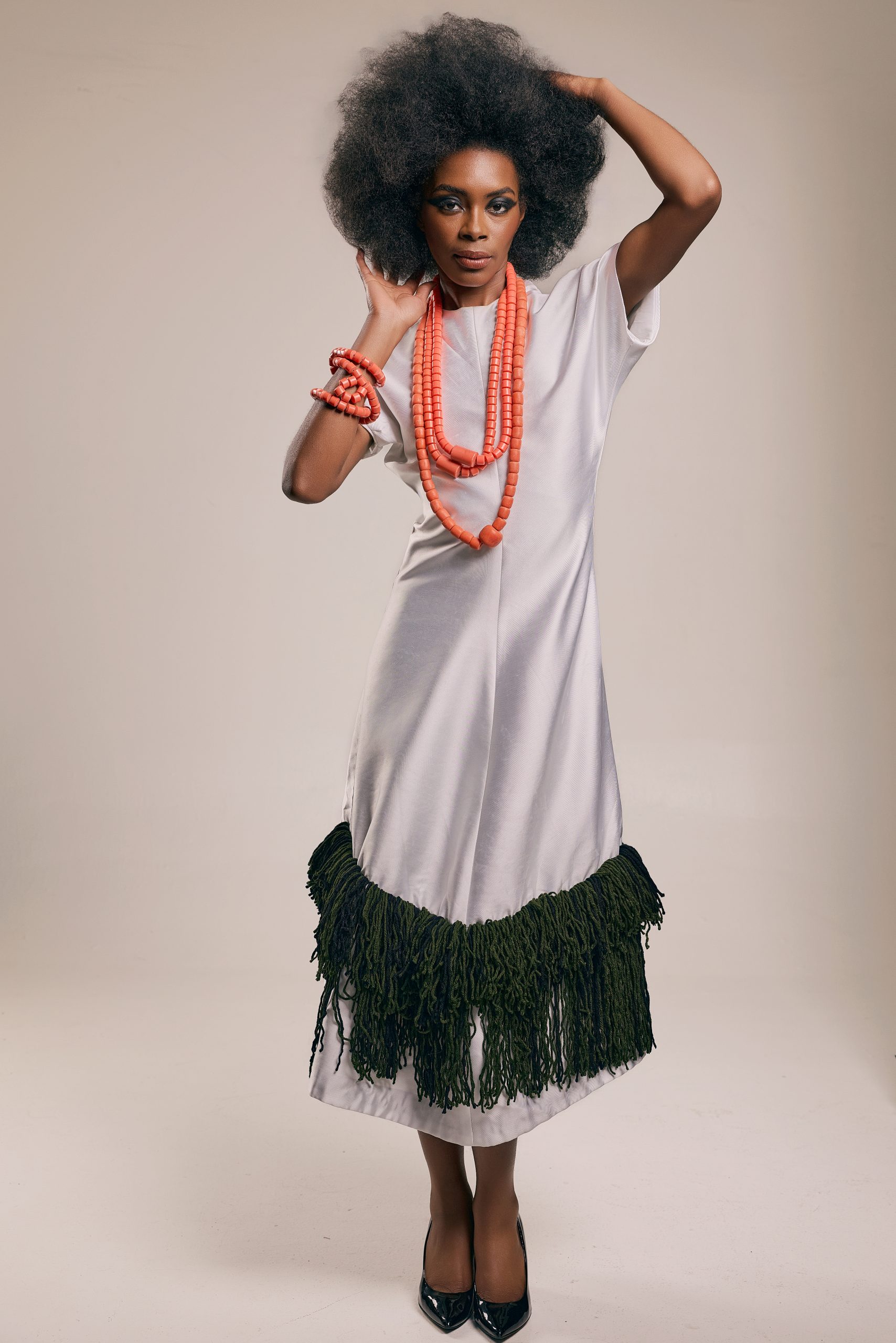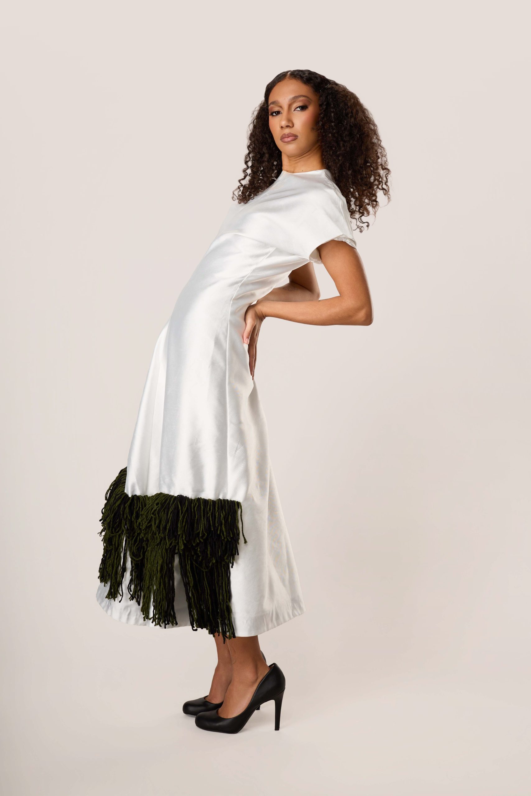 This is a piece about cultural weight carried lightly. The structured ivory body falls to a midi length. At the hem, a generous double layer of deep forest green fringe echoes the cadence of ceremony cloth.