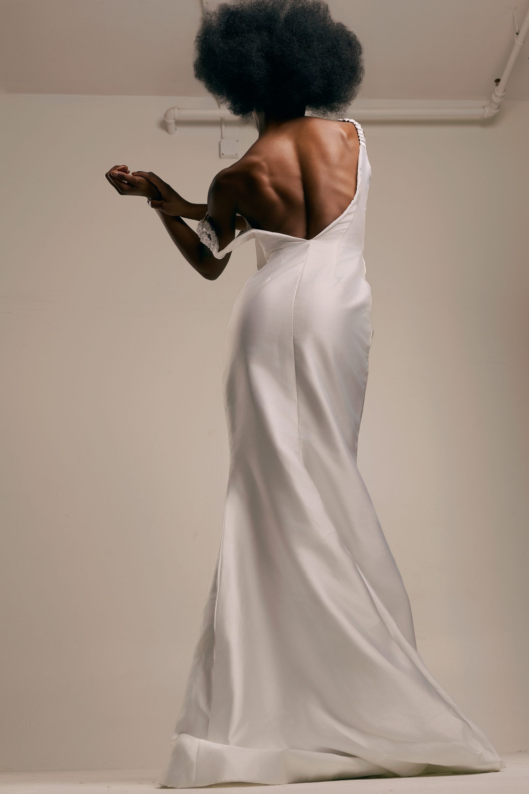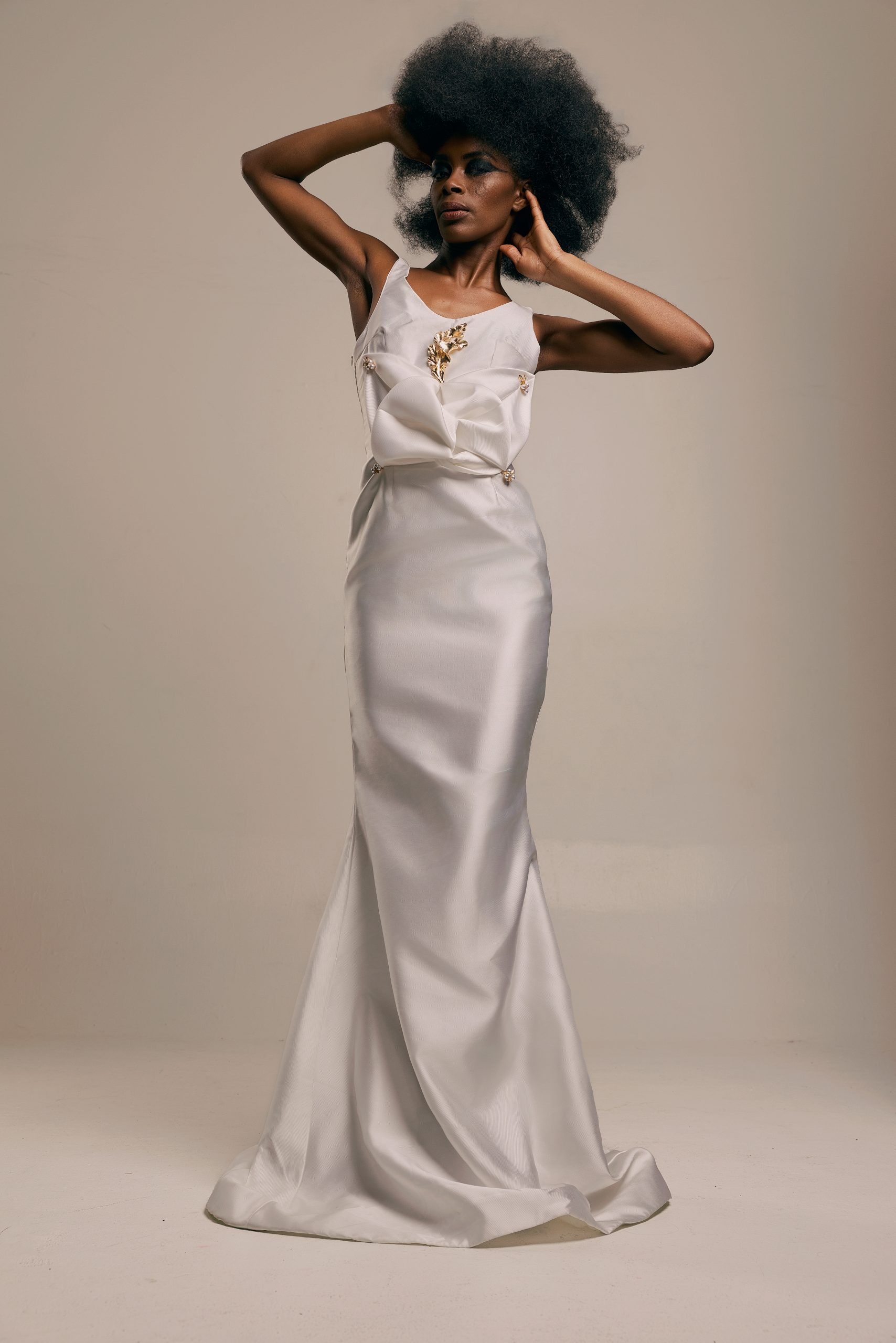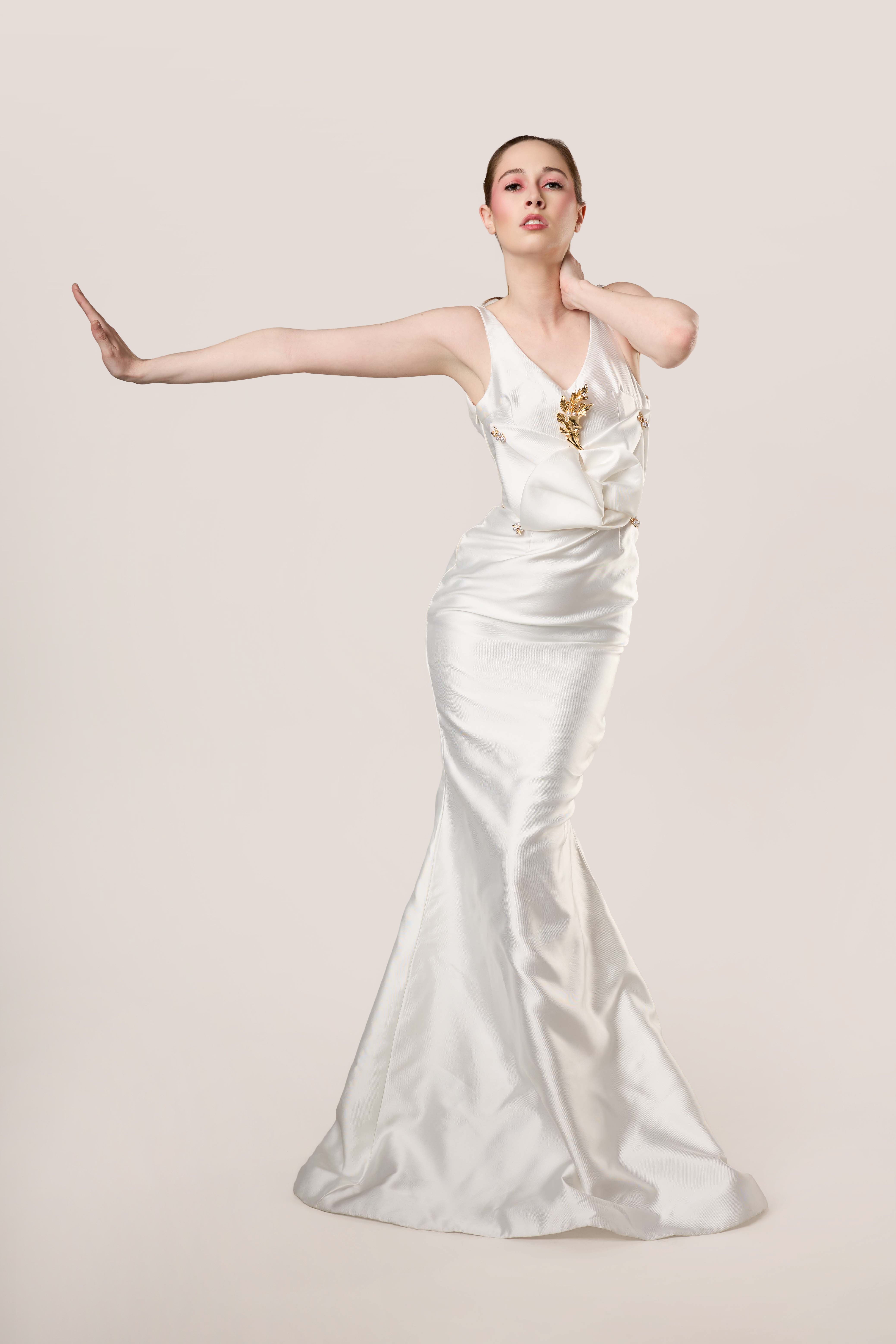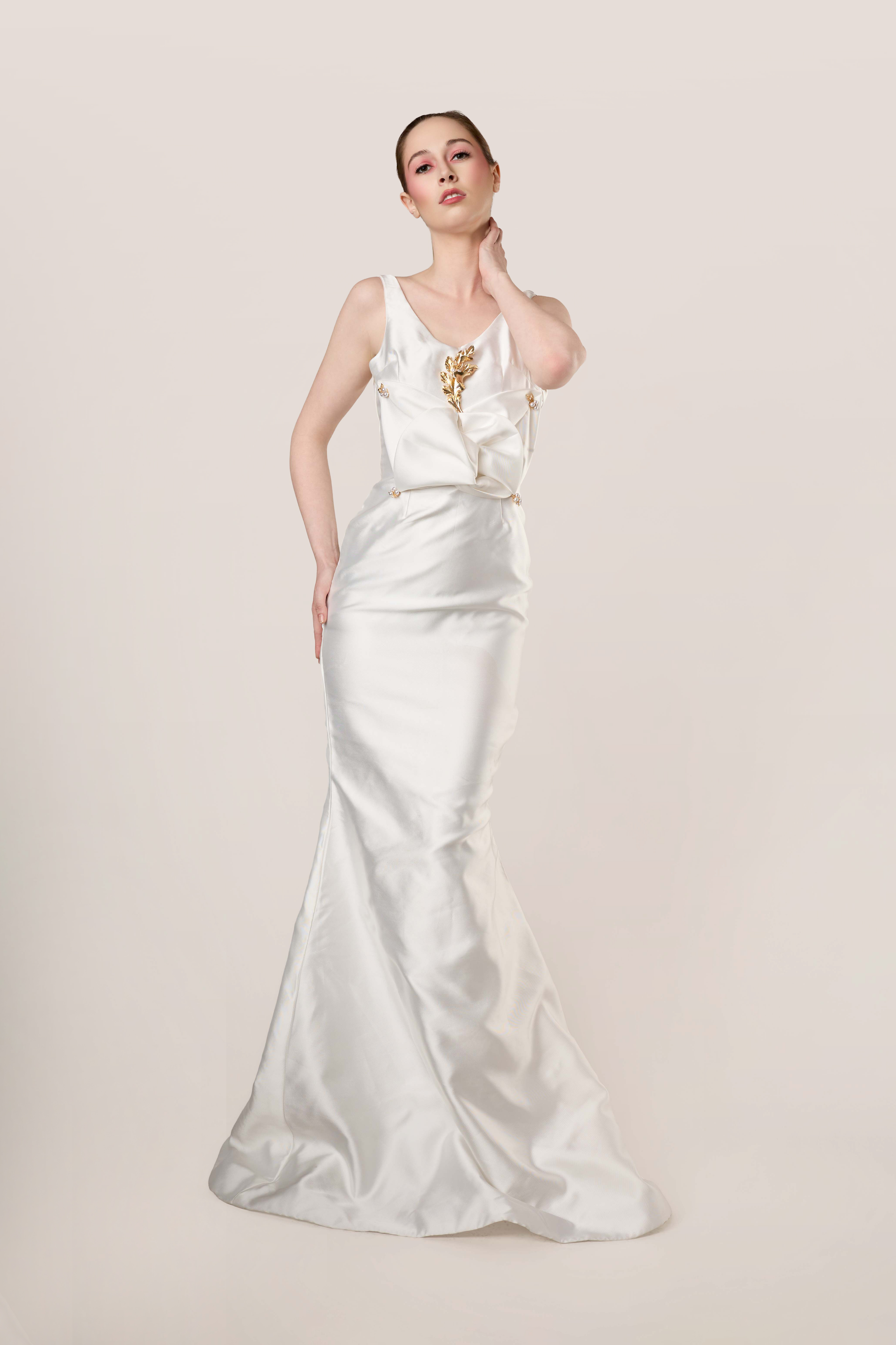 Refined and quietly commanding. Cut from a fluid ivory Mikado silk blend, the gown follows the body in a clean column silhouette before opening at the back in a deep, graceful scoop. At the front neckline, a hand-applied gold embellishment detail serves as the sole adornment, positioned with the precision of a jewel.