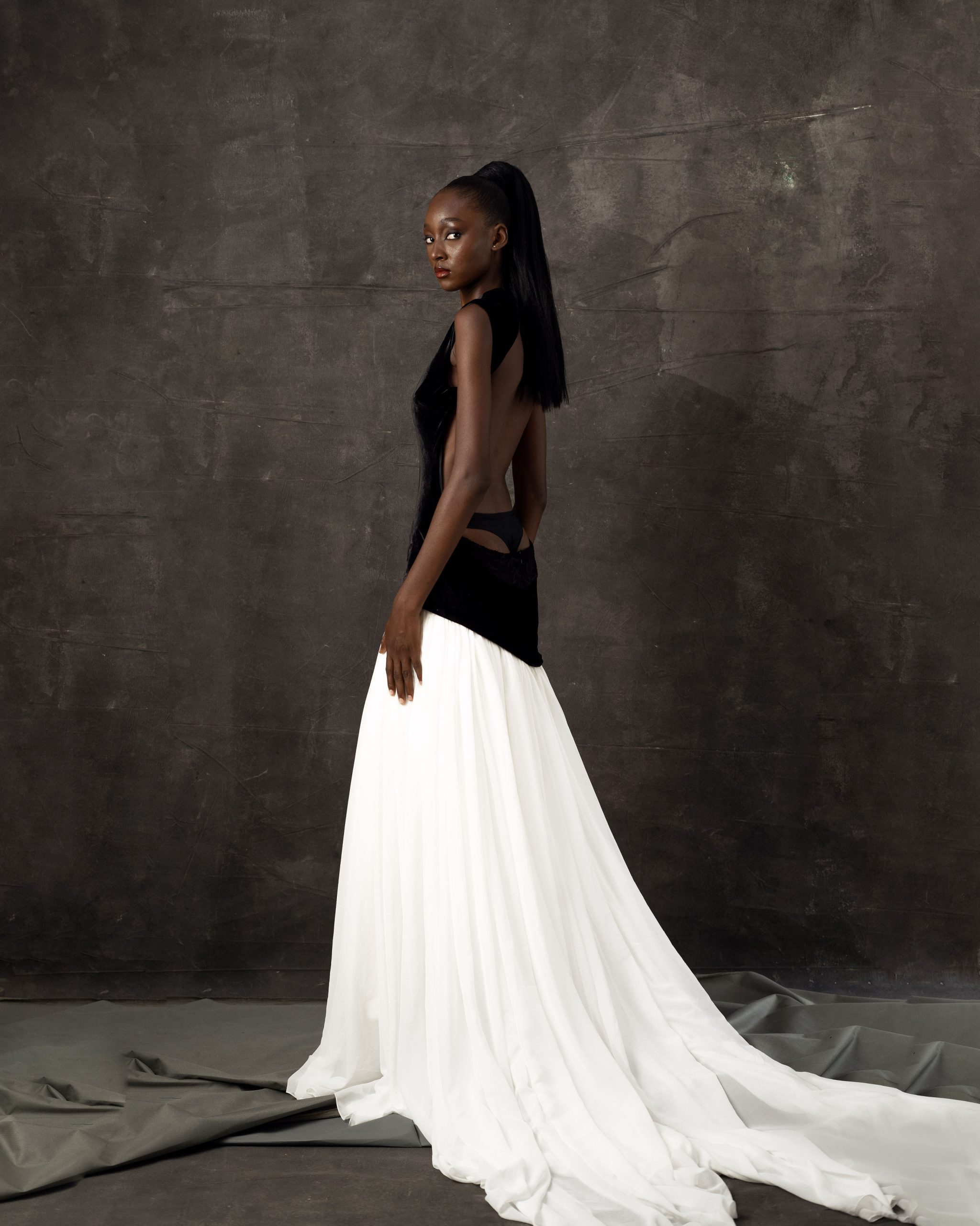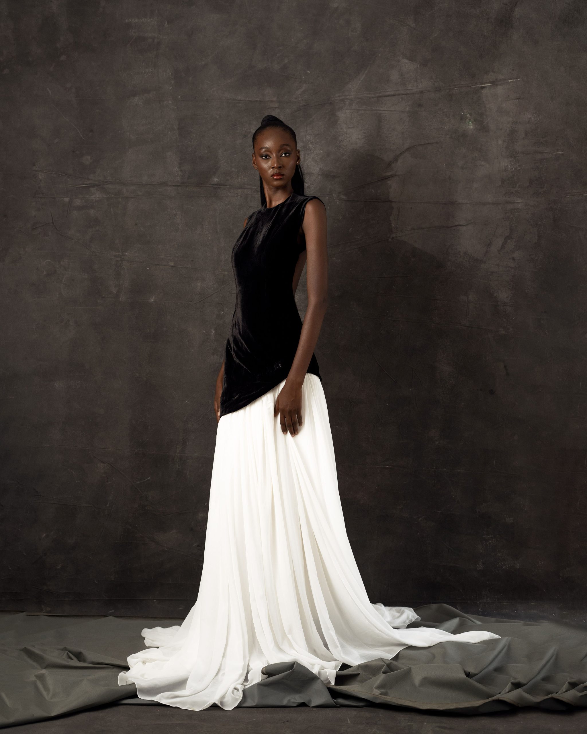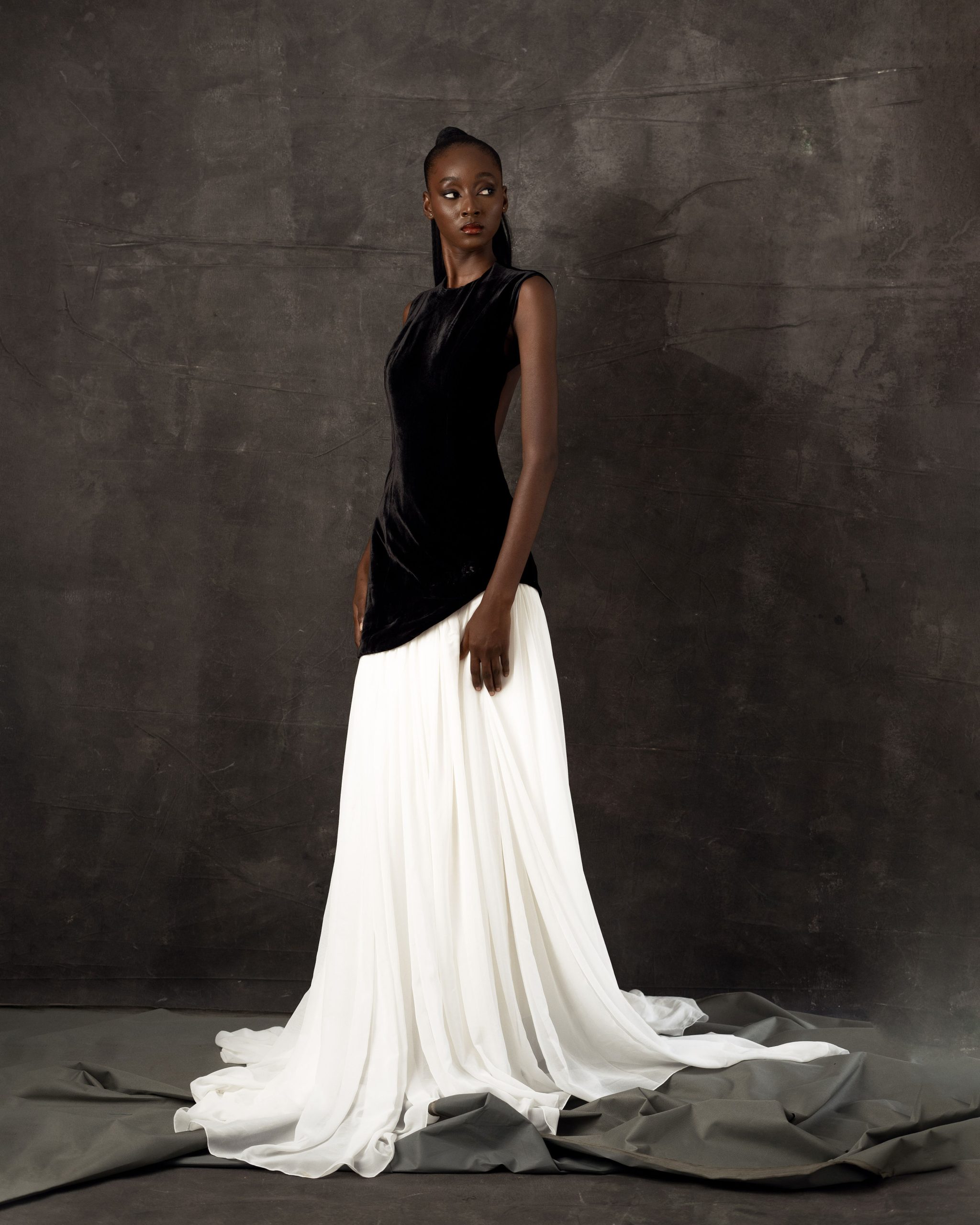 This gown answers one of fashion’s most compelling structural questions: what happens when two fabrics that are temperamental opposites are asked to become one garment? The fitted velvet bodice is sleeveless, boned at the sides for structure, and cut high at the back to create a clean horizontal line at the waist before the fabric transitions. From that line, a bridal chiffon skirt in ivory falls in long, sweeping layers to the floor and continues into a three-metre train. The contrast is absolute: the bodice is heavy, light-absorbing, and close to the body; the skirt is weightless, light-diffusing, and expansive. Together they create a silhouette that shifts dramatically in character as the wearer moves, the static formal presence of the velvet giving way to the kinetic, processional quality of the chiffon. A gown that rewards movement.