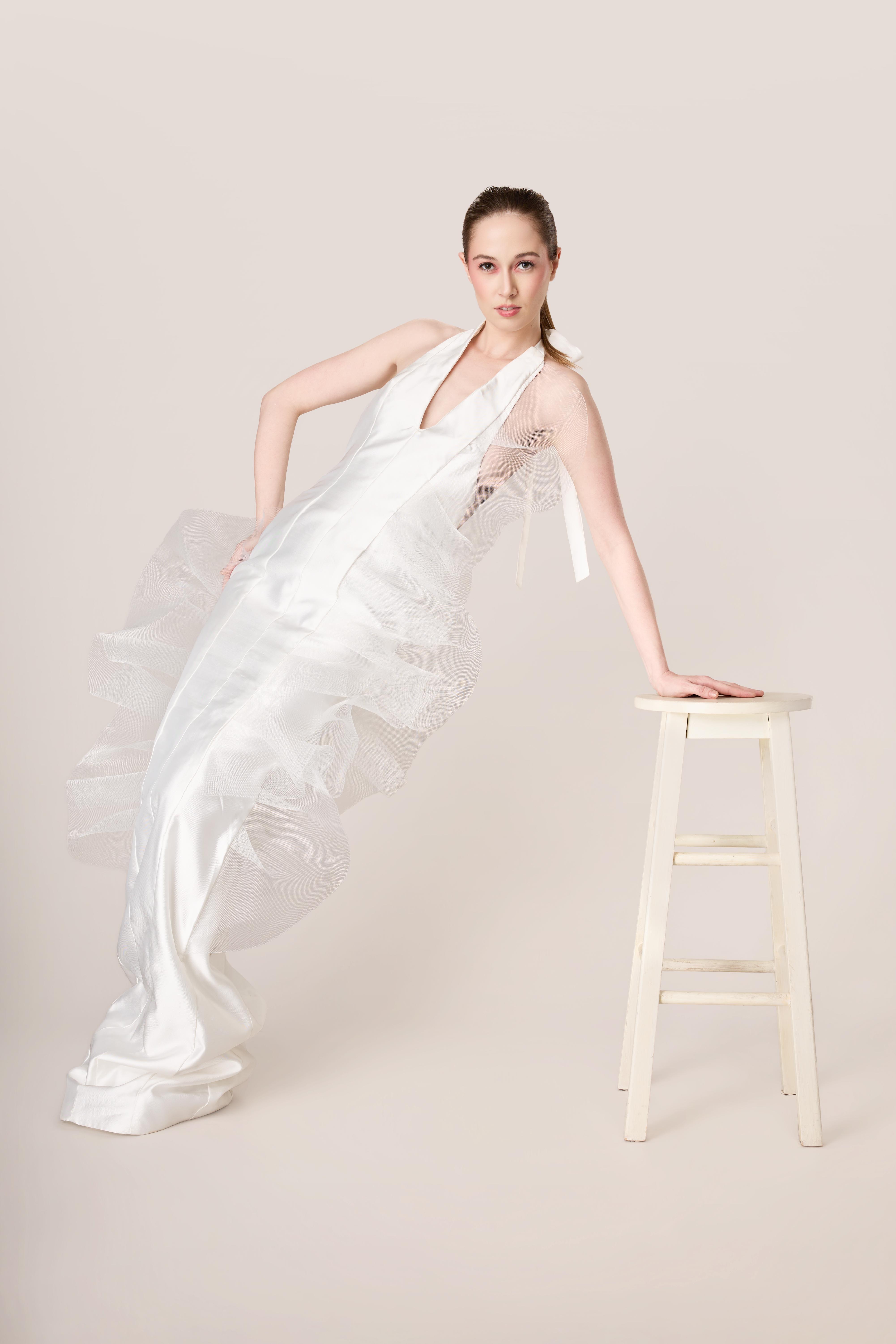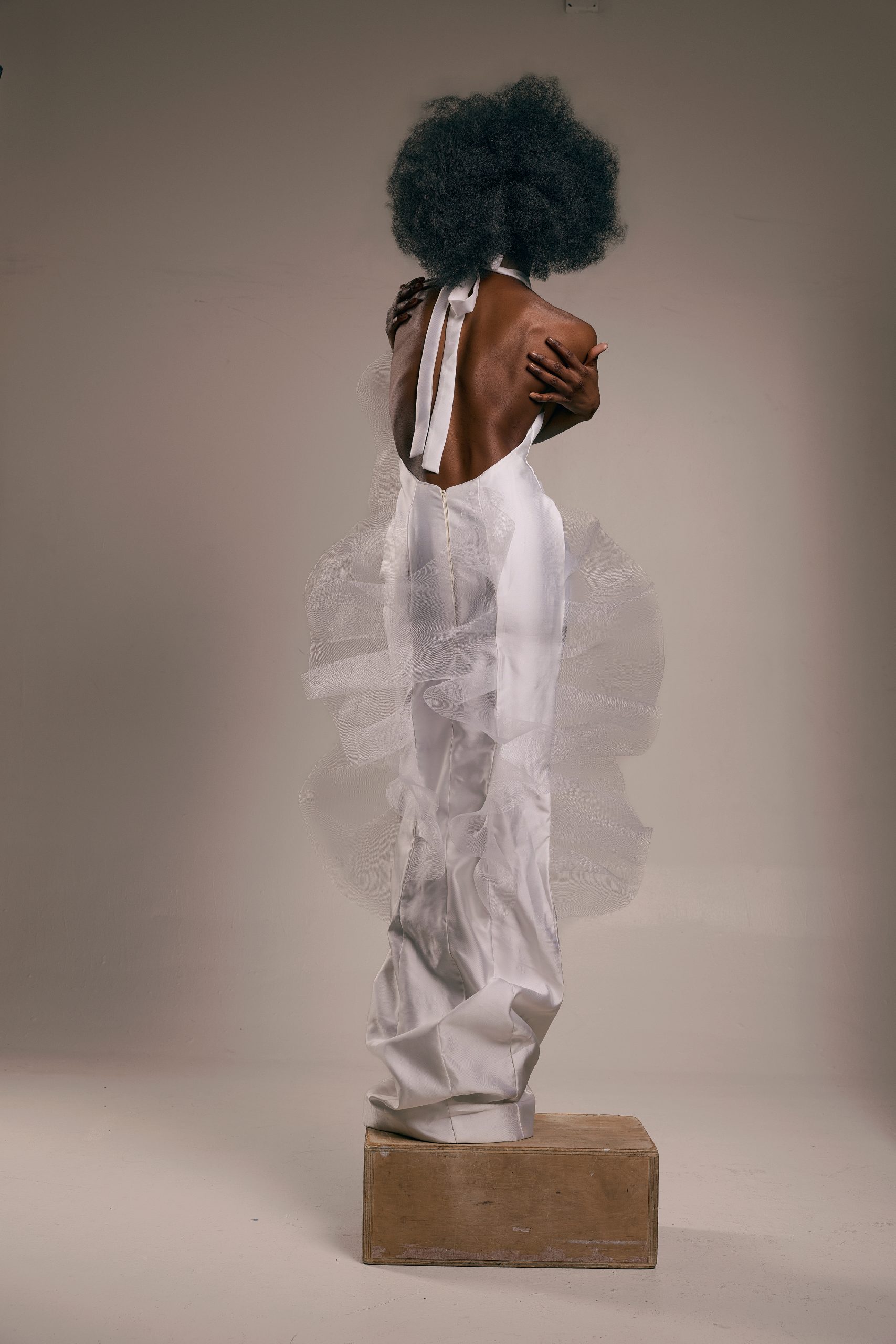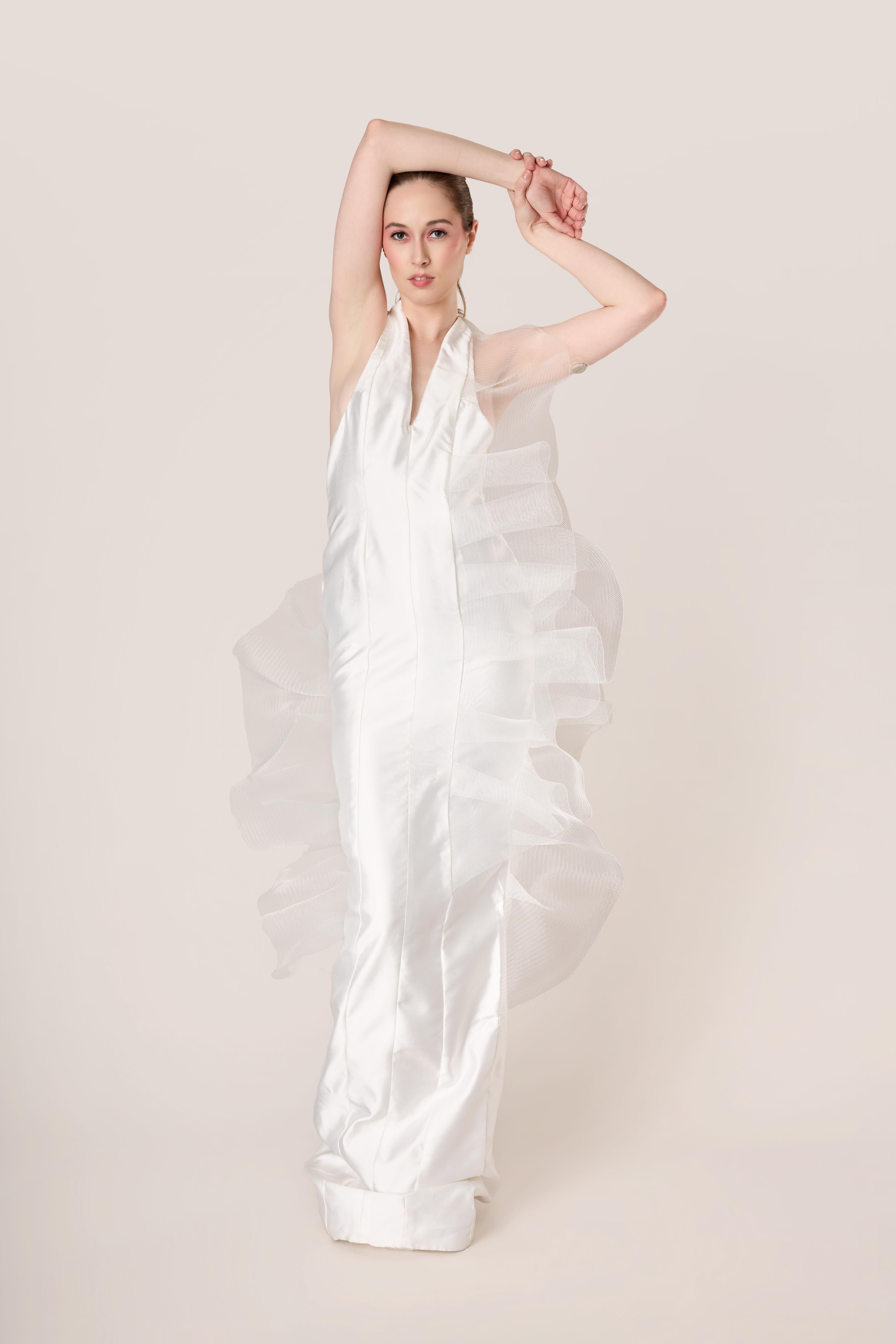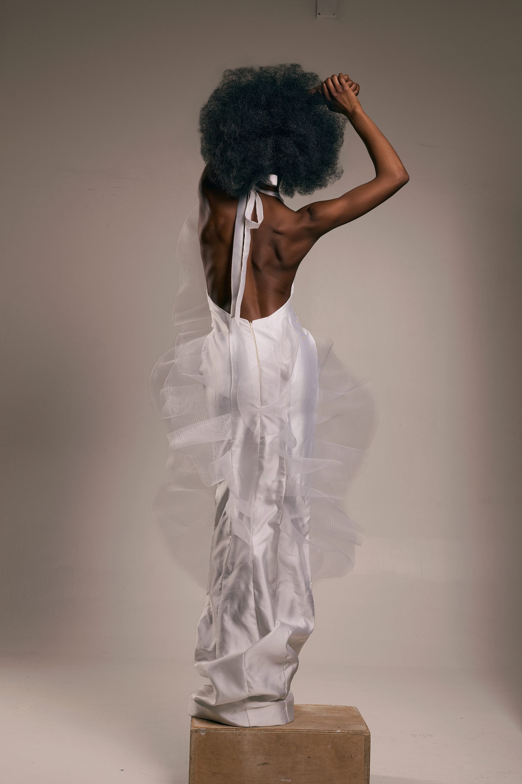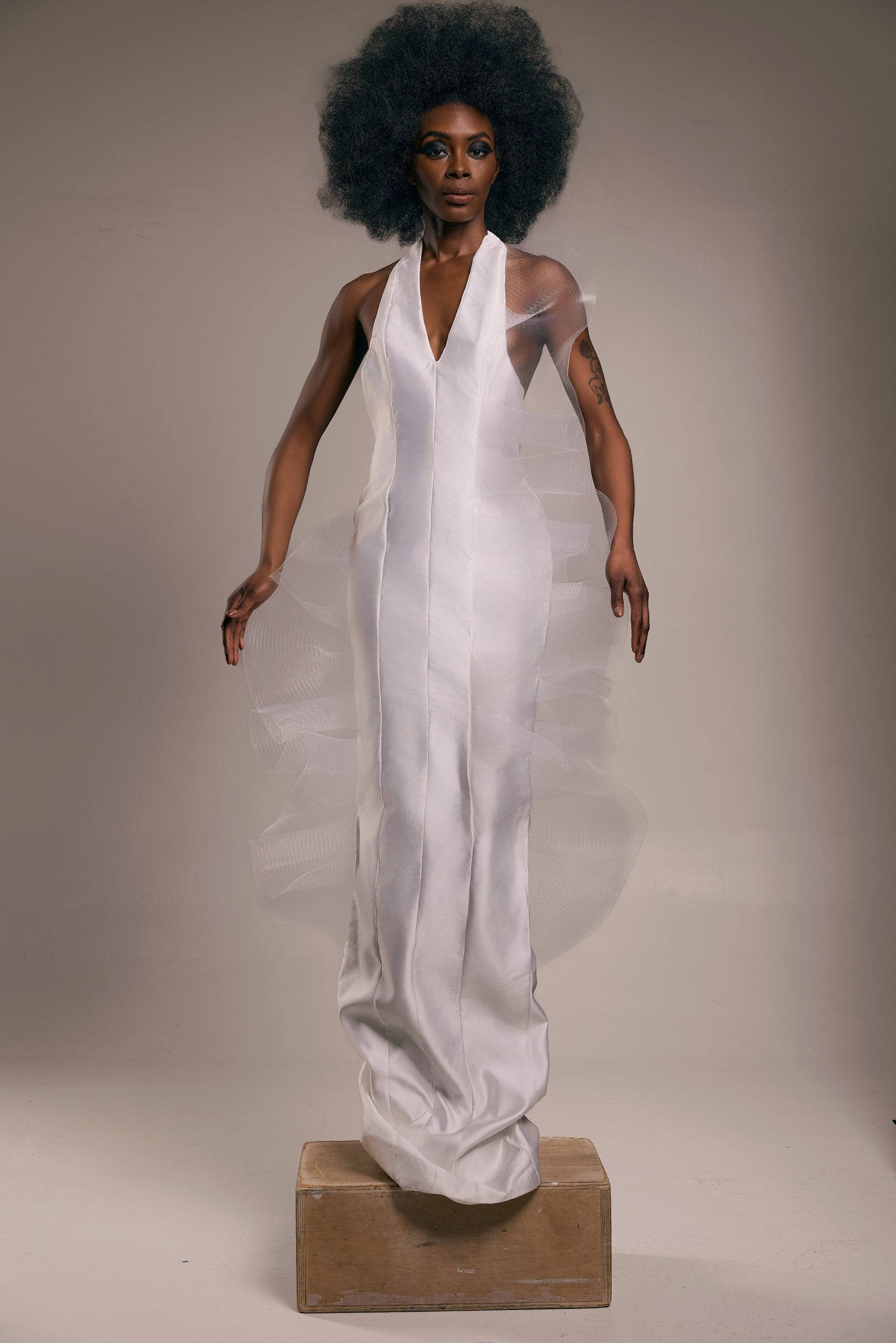 A deep V-neck halter neckline anchors the silhouette while panels of sheer white horsehair cascade freely from the bodice, creating a sculptural yet ethereal effect in motion. The back closes in a simple tie, keeping the construction honest and the drama in the fabric itself.