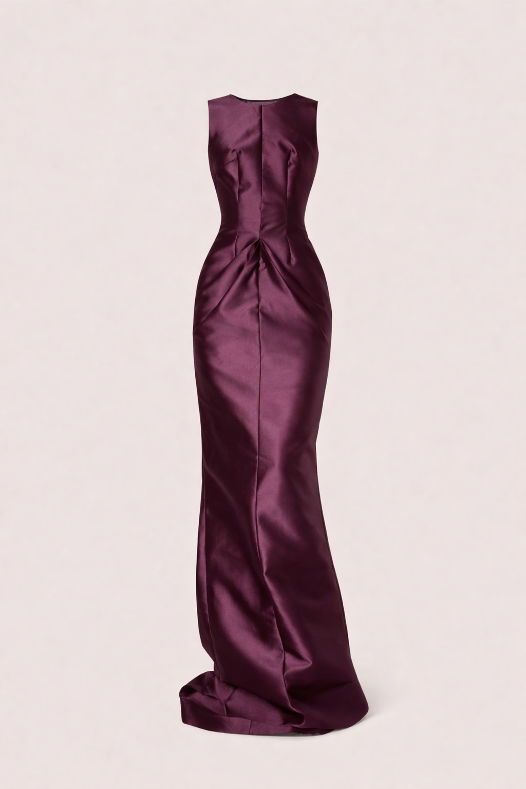 The signature piece of the Veillée FW26 collection. Heavyweight Mikado silk blend in a deep saturated aubergine that reads differently in every light. Tonal seam lines trace the bodice with corset-like precision, structure without restriction.