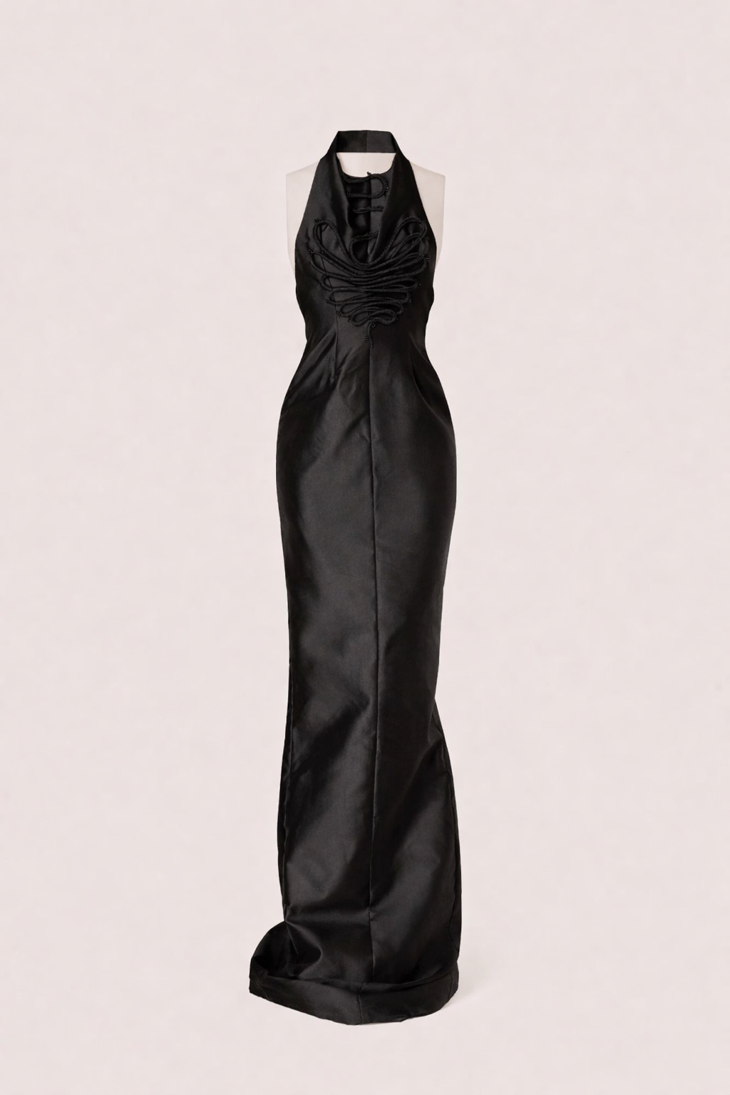 A halter neckline draws the eye upward while the column fall grounds the garment in absolute simplicity. The open back is clean and precisely cut, framed by two thin straps. The Mikado silk blend moves with controlled weight, resisting excess while retaining enough fluidity to breathe.