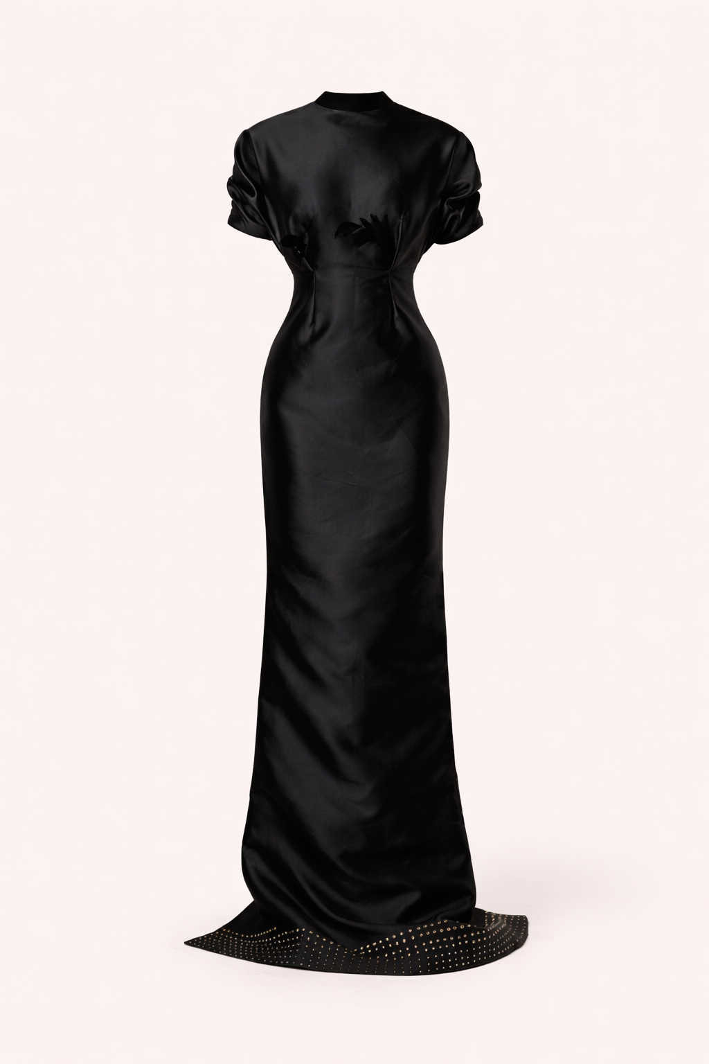 A voluminous half-length kimono sleeve sits in careful balance with the gown’s clean, floor-grazing column line. A self-fabric belt cinches the waist. At the hem, a band of precision-placed gold studs references both military uniform and ceremonial regalia.