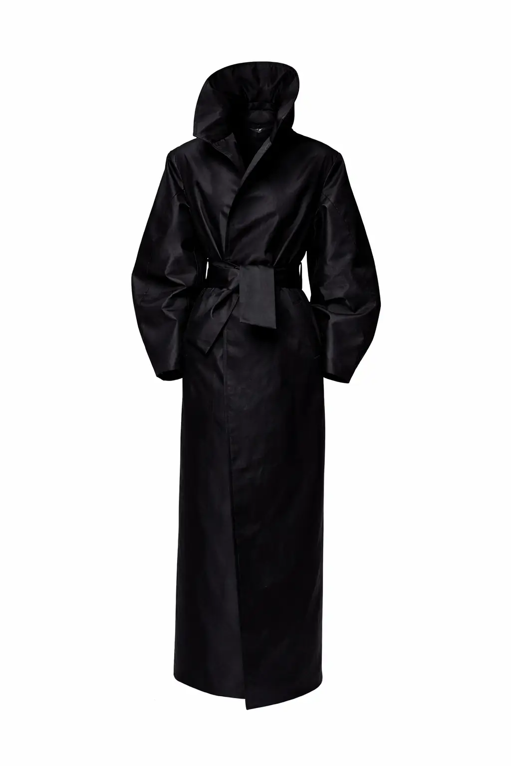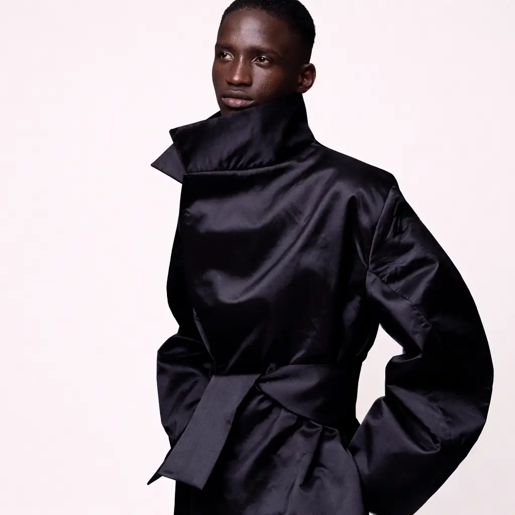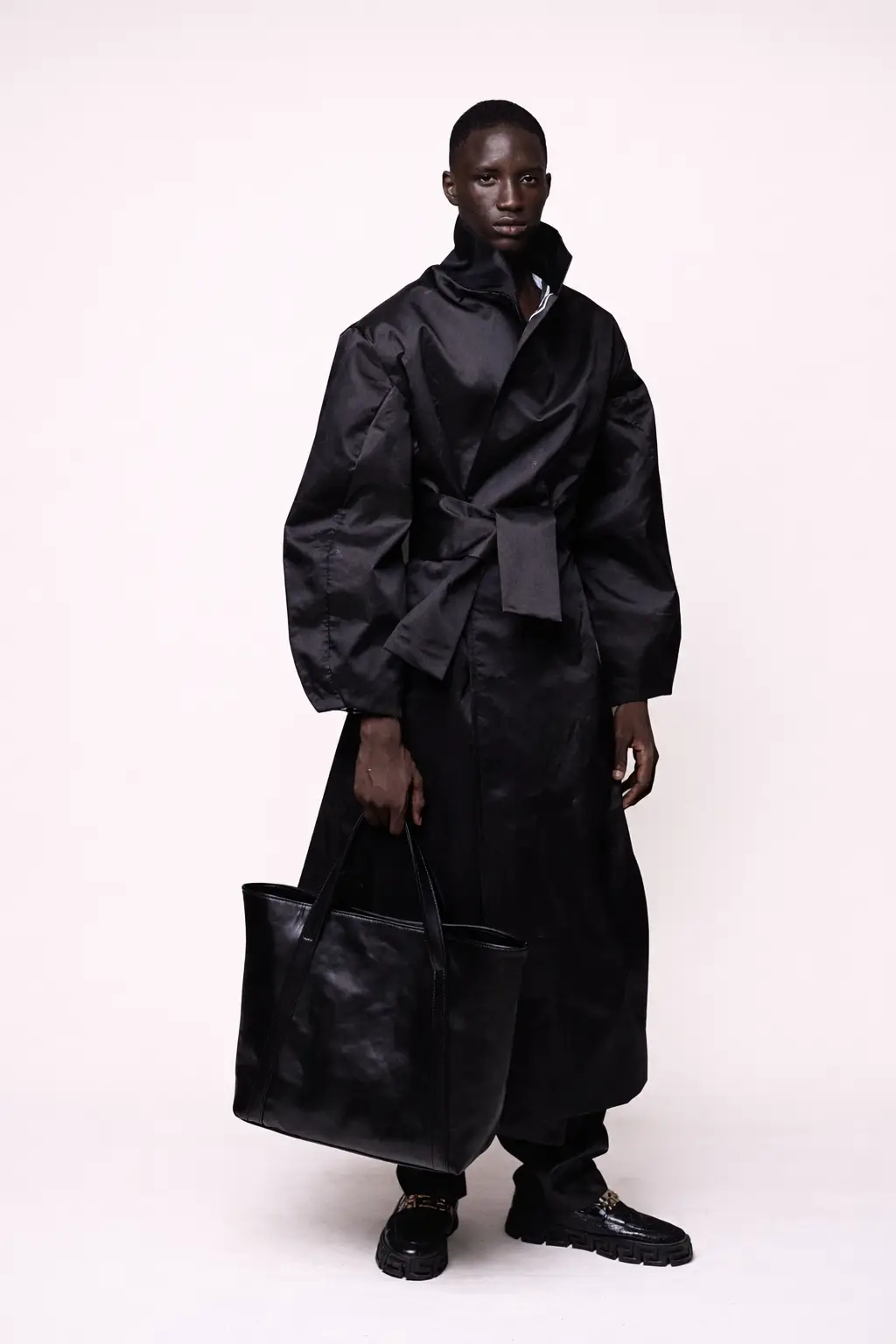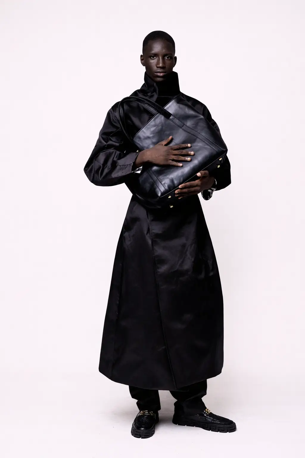 This coat is structured around the logic of enclosure. The body wraps and ties at the waist through a wide self-fabric belt, the front panels overlapping in a deep V that recalls the layered geometry of the boubou and the draped austerity of Sahelian dress. The collar rises high and folds over itself — part shield, part statement. The sleeves billow at the upper arm before gathering at the wrist, channelling movement into form. In floor-length black mikado, it carries weight in both senses: physical and symbolic. Worn here with a structured black leather tote and portfolio clutch from the Joseph Ejiro accessories line. Each piece is made to measure in San Diego and fulfilled individually to the client’s exact dimensions.