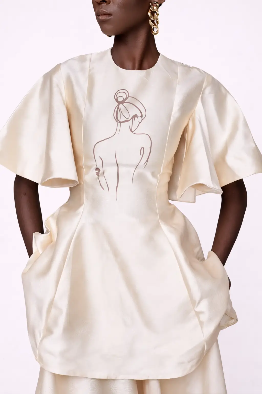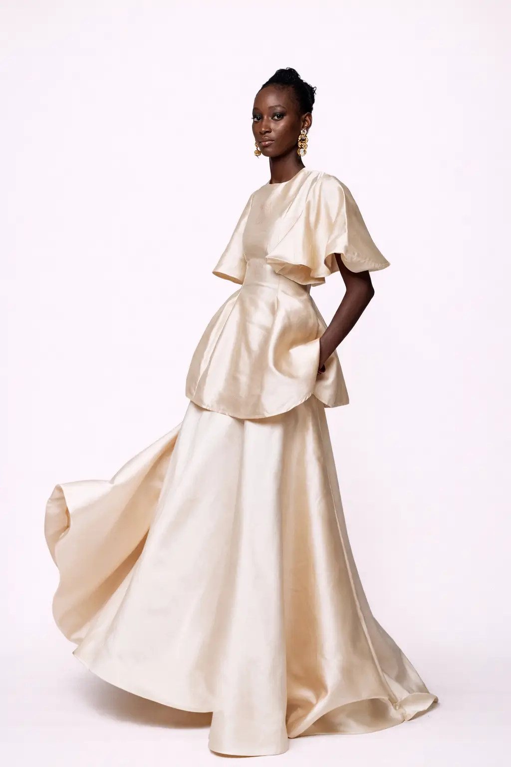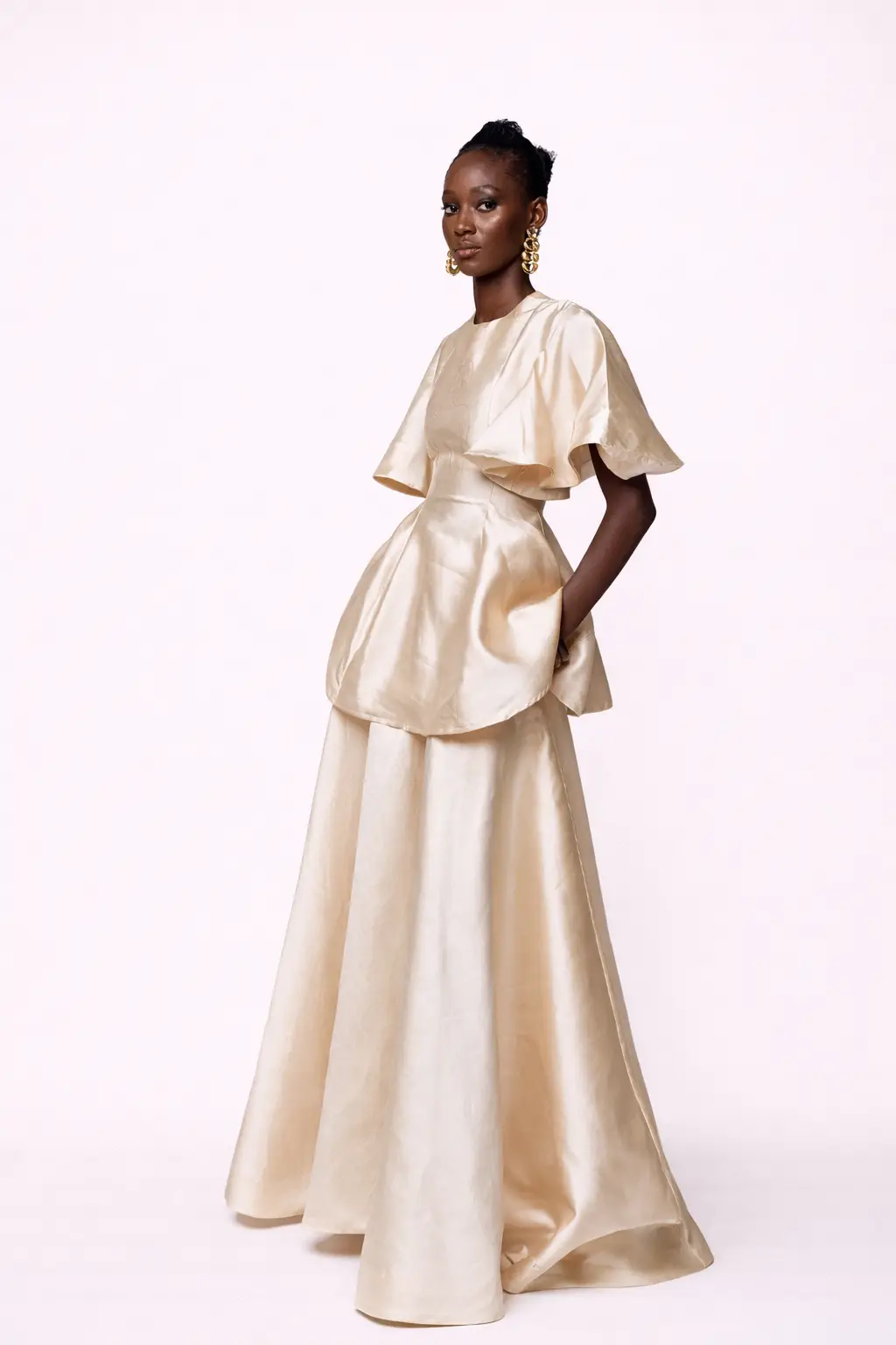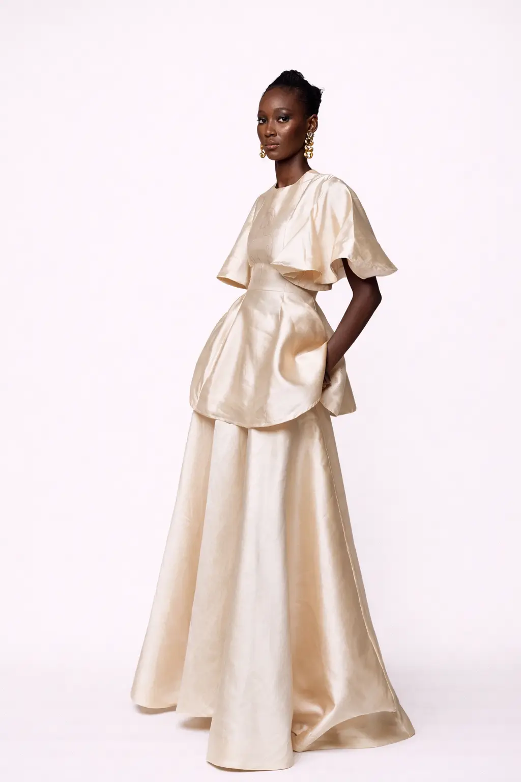 There is a language of occasion embedded in this silhouette. The top takes its shape from the peplum and the cape simultaneously: structured at the torso, it fans outward at the shoulder into wide, rounded flutter sleeves that fall to mid-arm, then gathers back into a defined peplum tier at the hip. The ball skirt beneath is full, cut from multiple panels of champagne mikado, and sweeps the floor in a wide, rolling hem. In motion, the skirt opens and closes like a held breath. The colour is champagne: not white, not gold, the precise register of celebration restrained. Each piece is made to measure in San Diego and fulfilled individually to the client’s exact dimensions.