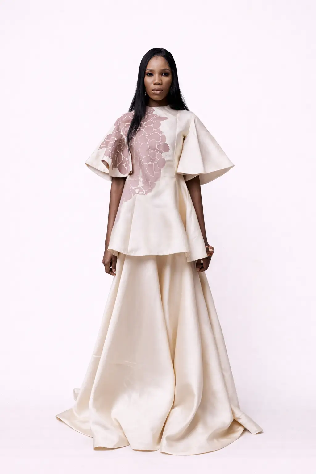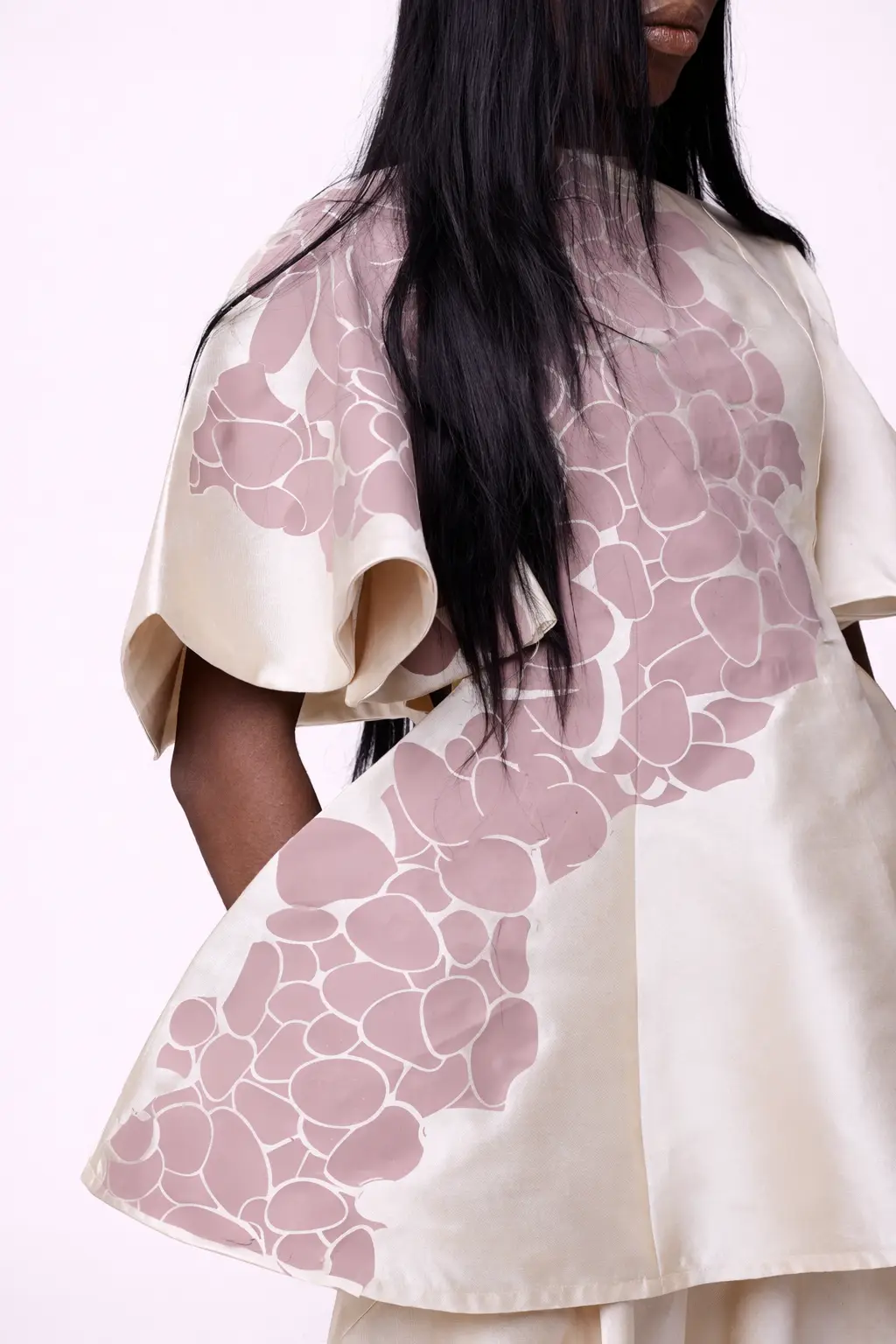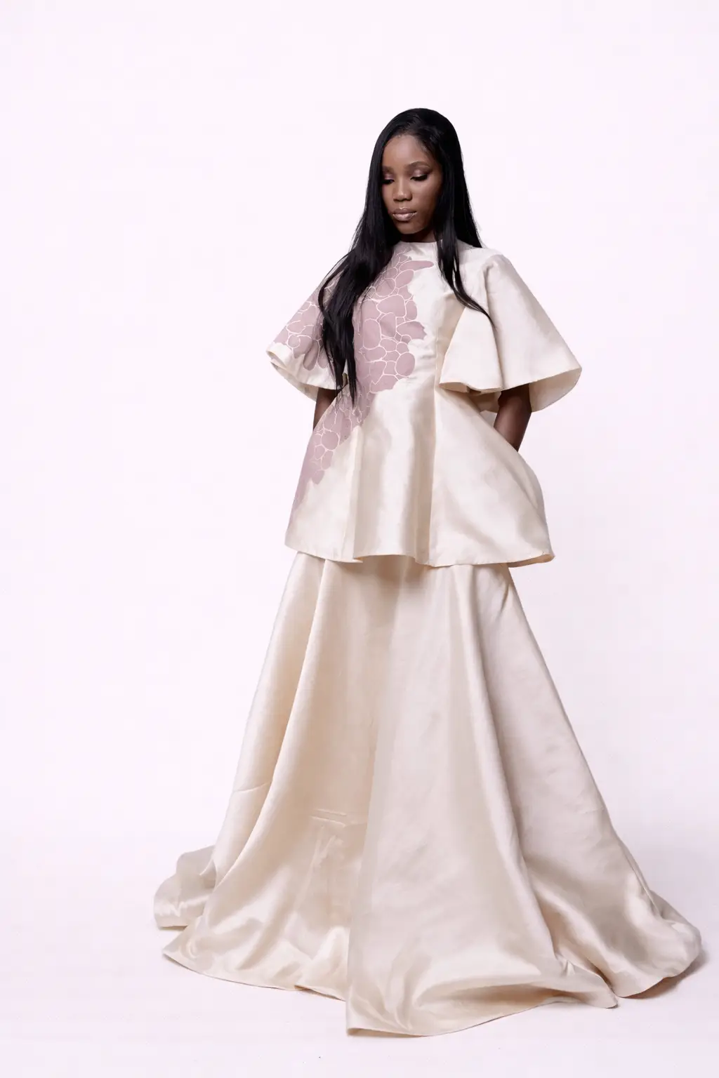 The print occupies the top with the confidence of a conversation that began before the wearer enters the room. An organic, cell-like pattern in dusty mauve and pale rose floats across the cream mikado, irregular, biomorphic forms that recall resist-dye traditions and the kind of natural patterning found in Adire cloth, abstracted fully into something contemporary. Wide flutter sleeves extend the print into motion, amplifying the visual field as the body moves. The peplum tier sits cleanly at the hip. Below, the ball skirt is plain cream, a deliberate quiet that lets the upper body speak without competition. The hem sweeps the floor in a full, generous circle. Each piece is made to measure in San Diego and fulfilled individually to the client’s exact dimensions.