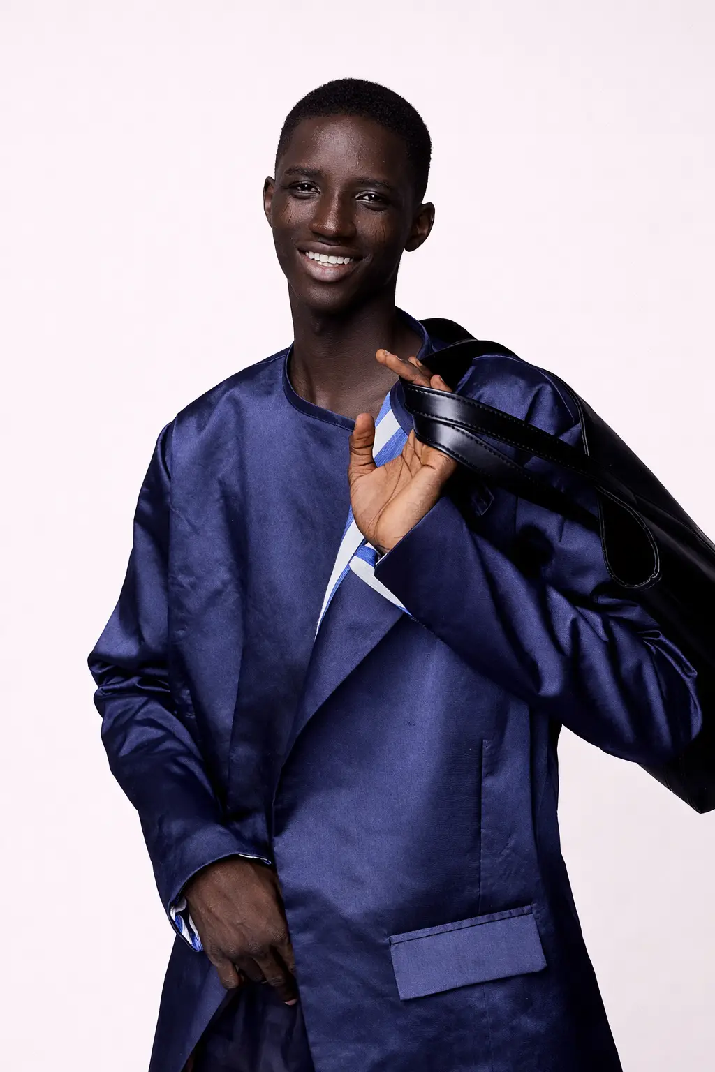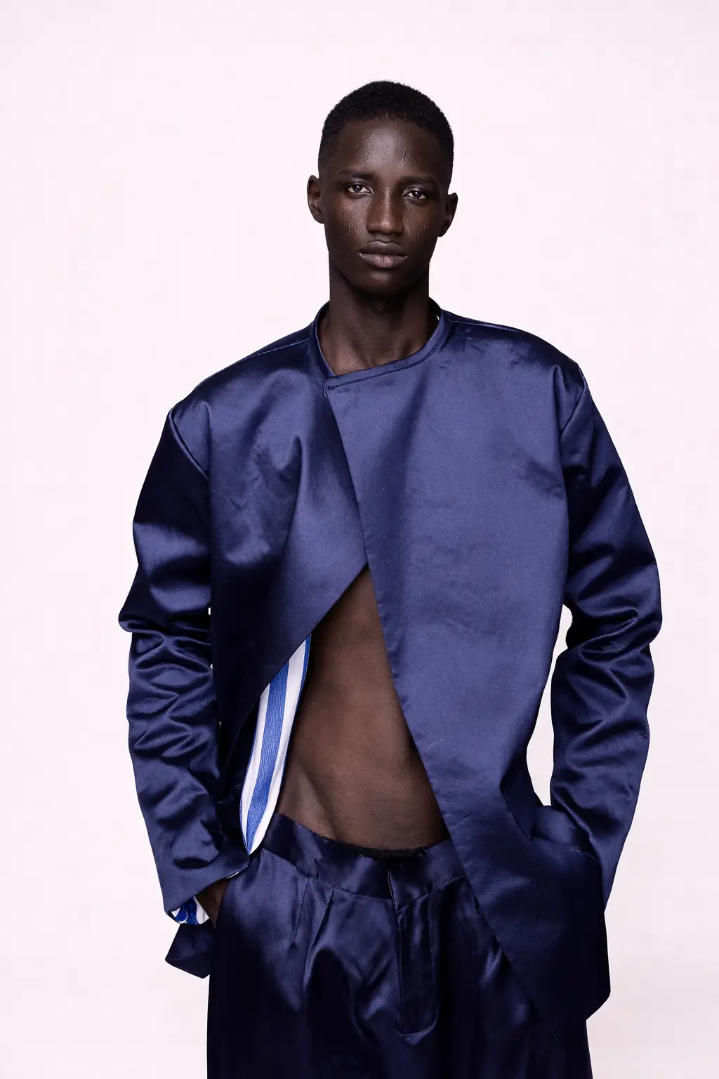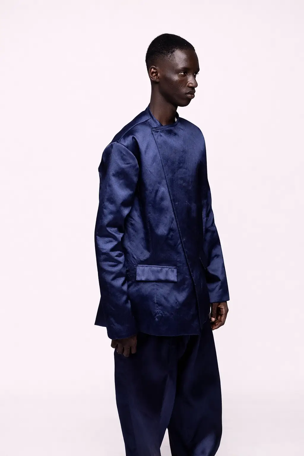 The collarless construction is not an absence but an argument: that authority needs no framing. This suit jacket sits straight at the neck, patch pockets set flush at the hip, the front opening unencumbered by lapel or collar. The interior carries a blue and white striped lining, a quiet flourish visible in motion, a detail that rewards proximity. The wide-leg trousers are cut generously through the thigh and leg, falling in a clean break at the foot. In midnight navy mikado, the suit moves between formal and fluid depending on how it is worn and what it is worn with. It is a garment built for a man who dresses by his own criteria. Each piece is made to measure in San Diego and fulfilled individually to the client’s exact dimensions.