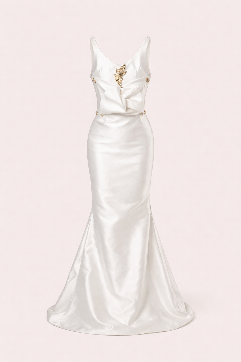 Refined and quietly commanding. Cut from a fluid ivory Mikado silk blend, the gown follows the body in a clean column silhouette before opening at the back in a deep, graceful scoop. At the front neckline, a hand-applied gold embellishment detail serves as the sole adornment, positioned with the precision of a jewel.