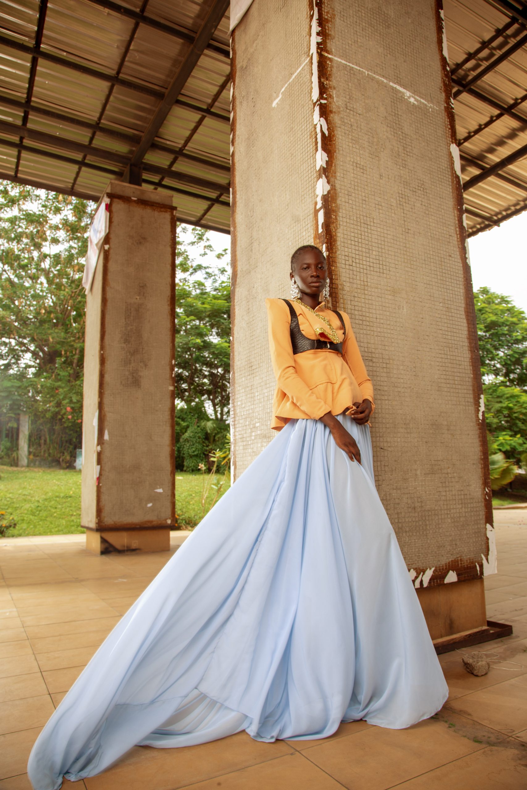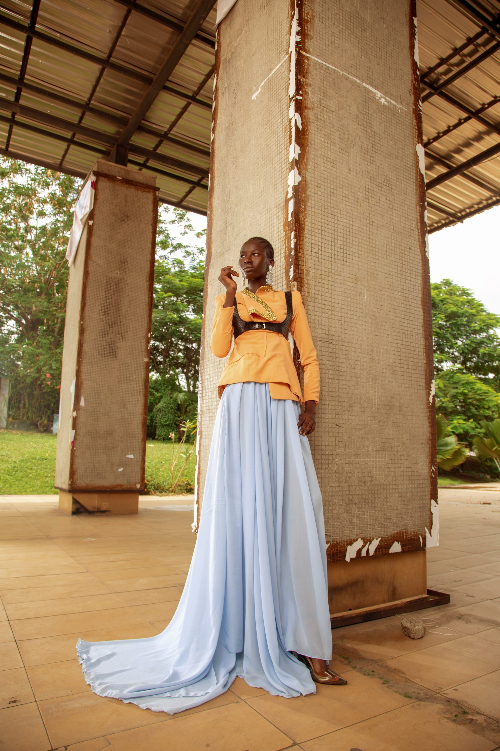 An amber silk-textured blouse with delicate gold embroidery at the neckline before yielding to a floor-length periwinkle skirt with a sweeping court train. The combination of warm amber and cool powder blue is deliberate, a pairing rooted in the chromatic duality found in Kalabari ceremonial dress, where layers of contrasting cloth read as social and aesthetic statement simultaneously. The train pools on the floor with quiet authority. Sold as a complete two-piece set. (does not include harness)