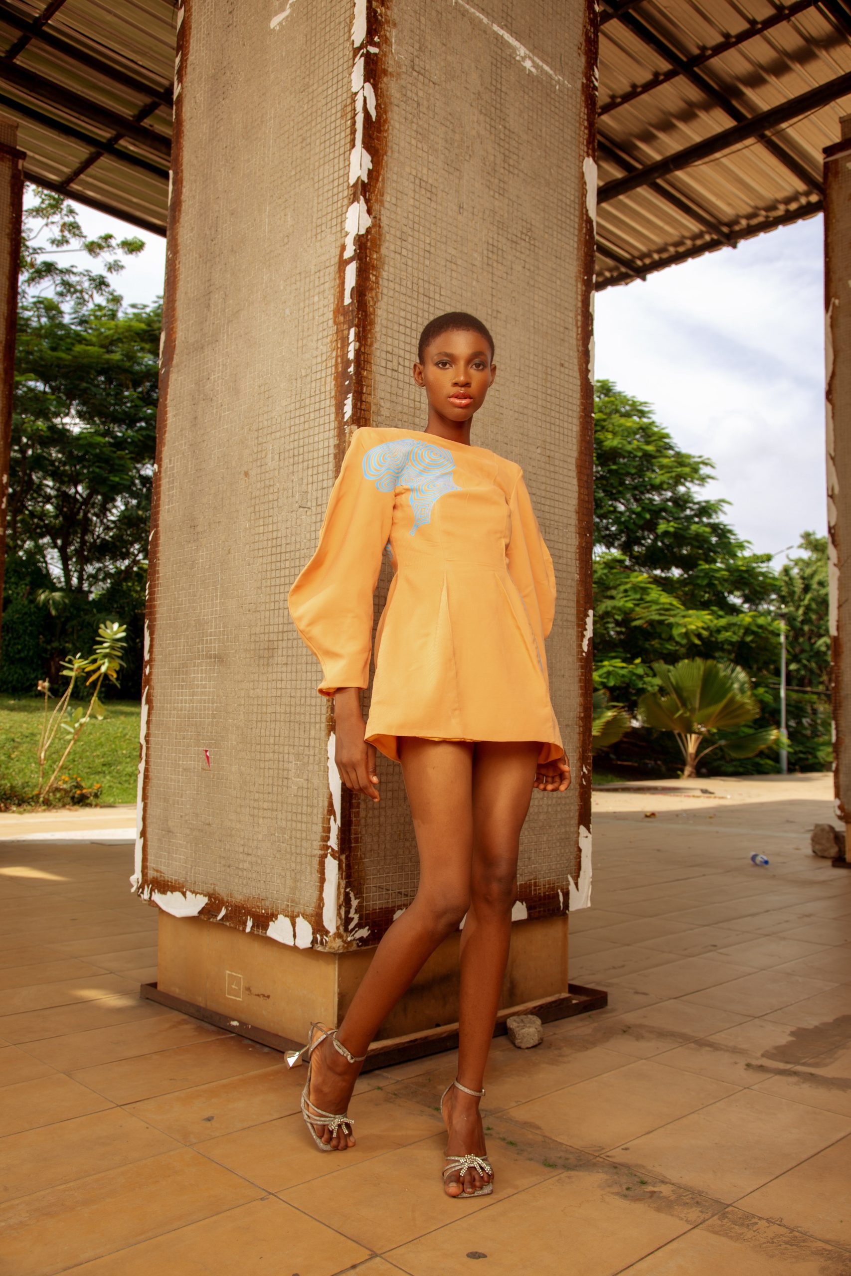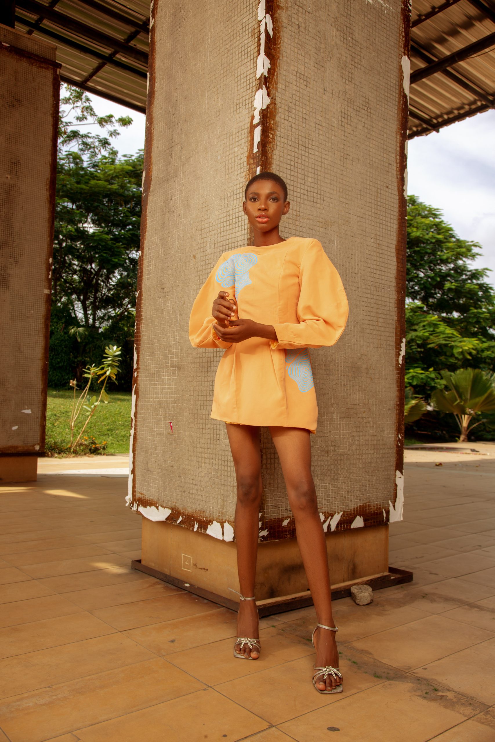 Rendered in warm amber fabric, this balloon-sleeve mini dress opens the collection with the graphic authority of Uli body markings transposed onto structured cloth. Two large ash-toned abstract panels break across the bodice and skirt like tide marks on stone, while voluminous bishop sleeves soften the geometry with their gathered, falling weight. The hemline sits high and uncompromising, the silhouette entirely sure of itself. A dress that understands scale as a language.