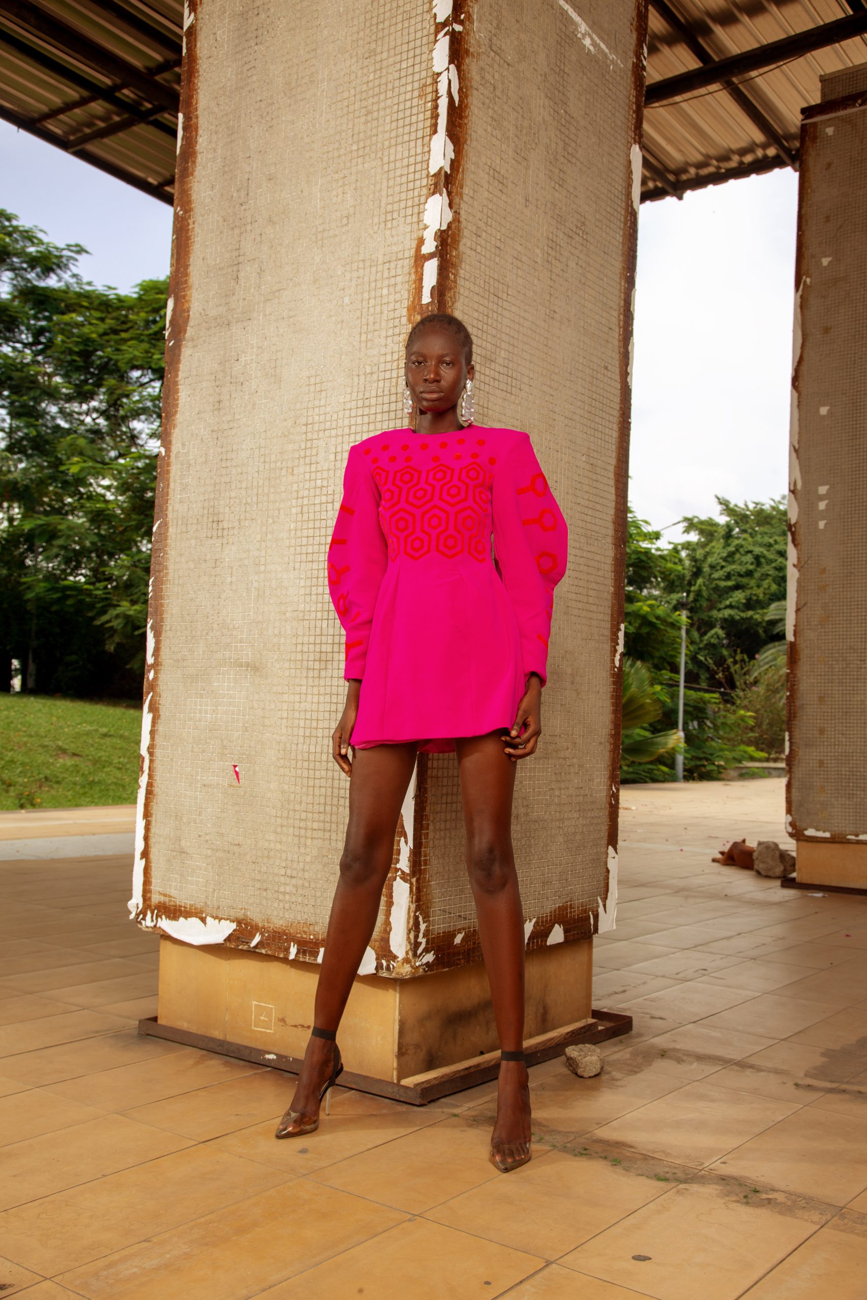 Saturated fuchsia fabric carries a tonal embossed circle pattern across the chest and sleeves, visible only in shifted light, a quiet detail that rewards proximity. The sleeves balloon dramatically at the forearm before gathering at the wrist, a silhouette with precedent in the voluminous wide sleeves of Hausa ceremonial boubou. The dress ends above the knee with a clean hem. The shape is assertive and the color completely unapologetic.
