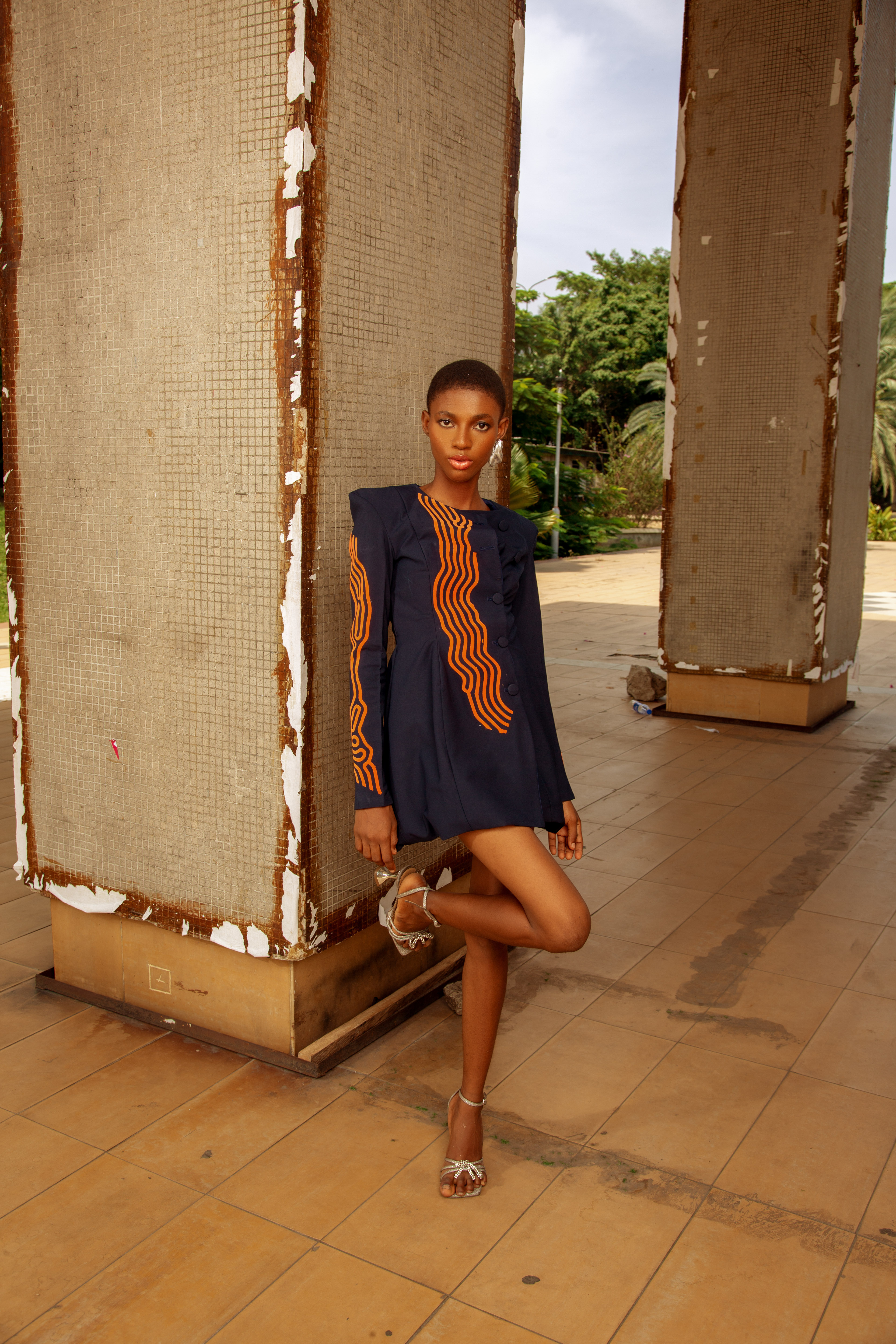 Orange lines move in undulating waves down the center front and along the side seams of a navy long-sleeve blazer-style mini dress, the pattern referencing the flowing linear vocabulary of Benin bronze relief work and the waved stripe motifs of Yoruba aso-oke weaving. The blazer construction is structured with defined shoulder architecture. The motion of the print against the stable navy ground creates a visual tension that animates the silhouette even at rest.