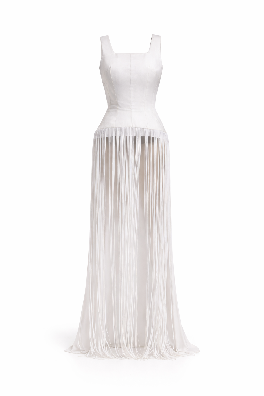 Top: structured cotton-blend corset (white). Skirt: Mikado silk blend waistband with floor-length woven fringe.